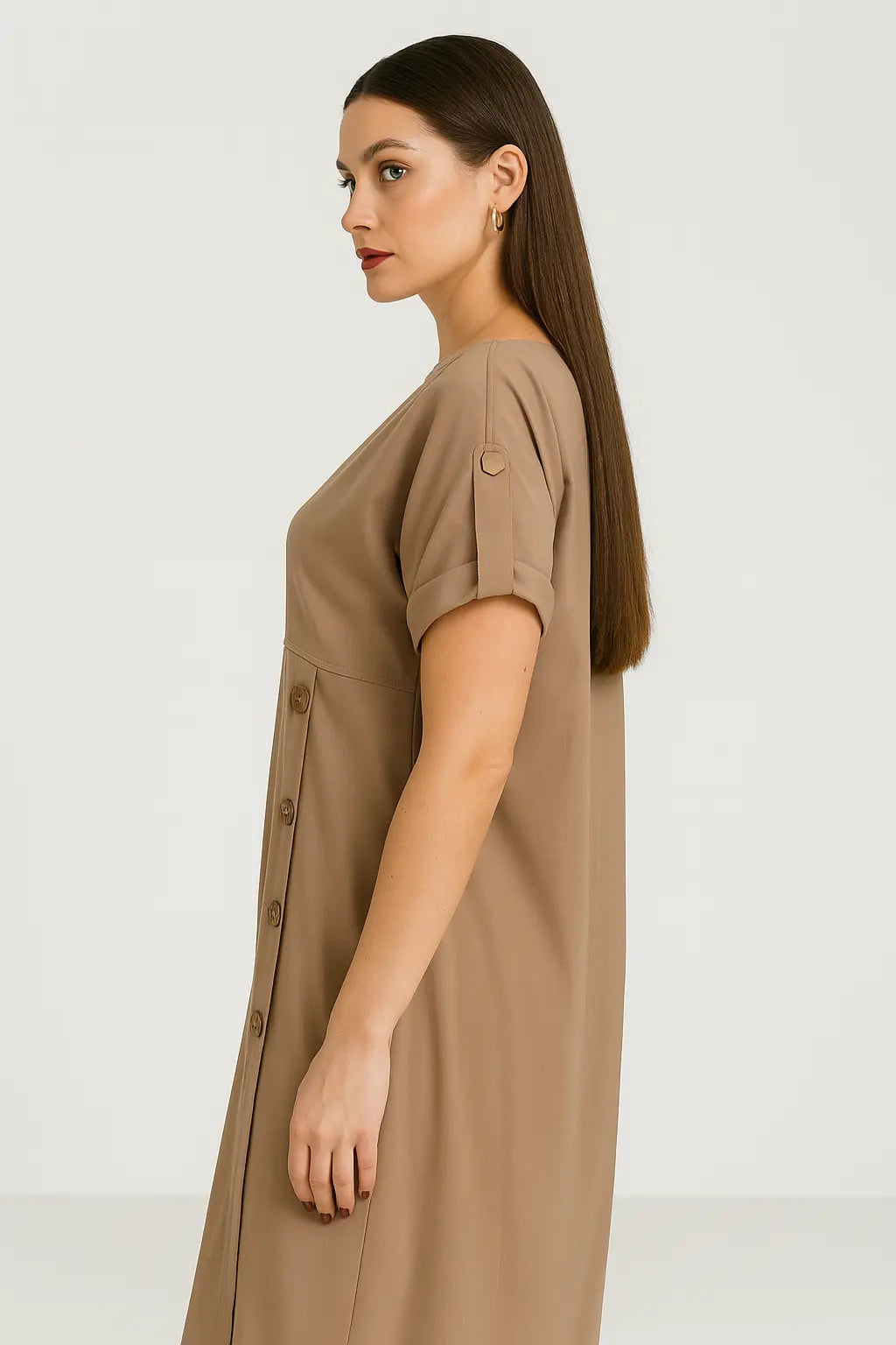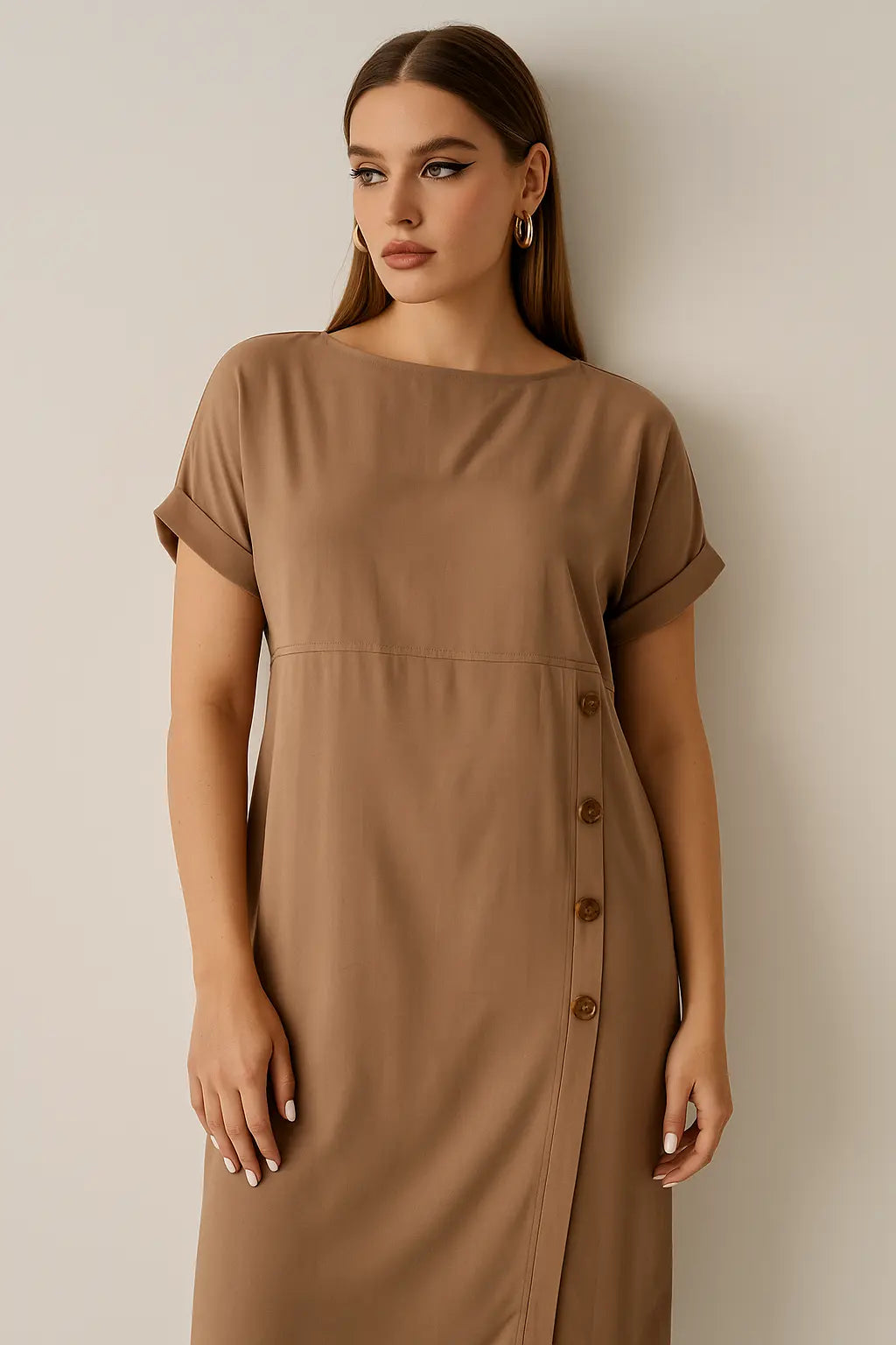Realizzato in morbida viscosa, questo abito girocollo è perfetto per ogni occasione, dal look casual per le vacanze alla città. Con il suo dettaglio di bottoni frontali lungo la gonna, dona un tocco di freschezza e praticità al tuo outfit. Non rinunciare allo stile, scegli questo abito versatile!