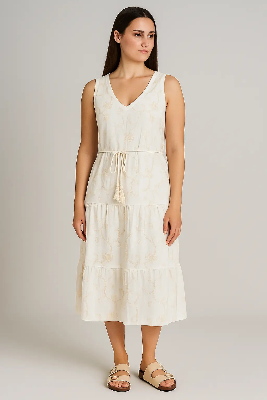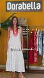 Romantico e femminile, questo abito lungo in cotone è la scelta perfetta per le giornate estive più calde. Realizzato in un leggero tessuto a base di cotone, presenta un elegante ricamo floreale a contrasto che dona carattere e movimento. La silhouette è morbida e svasata, valorizzata da una sottile cinturina in corda con nappine decorative che esalta delicatamente il punto vita. Il design senza maniche e lo scollo a V aggiungono un tocco di freschezza e versatilità, ideale da indossare sia in città che in vacanza.