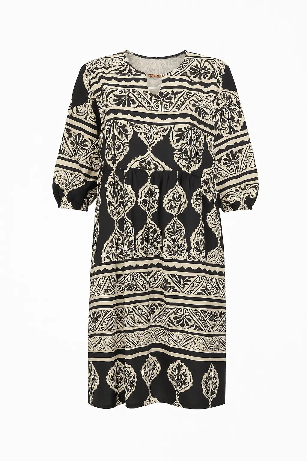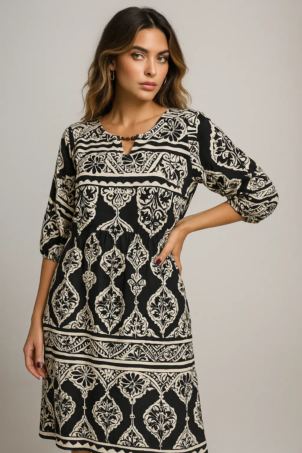 Scopri l’eleganza senza tempo di questo abito chemisier con stampa etnica in bianco e nero, perfetto per aggiungere un tocco sofisticato e originale al tuo guardaroba. Il modello presenta una vestibilità comoda e fluida, con una gonna leggermente arricciata che cade morbida lungo la figura. Il dettaglio del collo a contrasto in tessuto bianco, arricchito da una piccola scollatura a goccia e bottoncini effetto perla, dona al capo un accento raffinato. Le maniche corte con leggero arricciamento al fondo aggiungono volume e femminilità. Ideale da abbinare sia con sandali bassi che con sneakers per un look day-to-night.