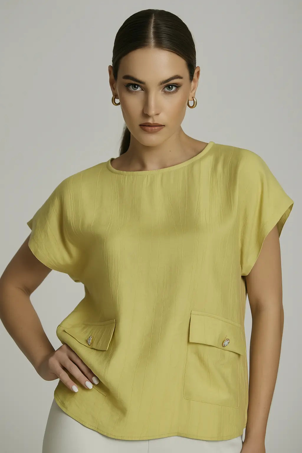 Questa blusa girocollo realizzata in viscosa è perfetta per un look quotidiano. Le tasche frontali aggiungono comodità e stile, mentre la viscosa garantisce freschezza e traspirabilità. Ideale per il lavoro o il tempo libero.