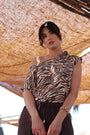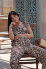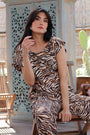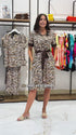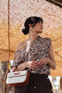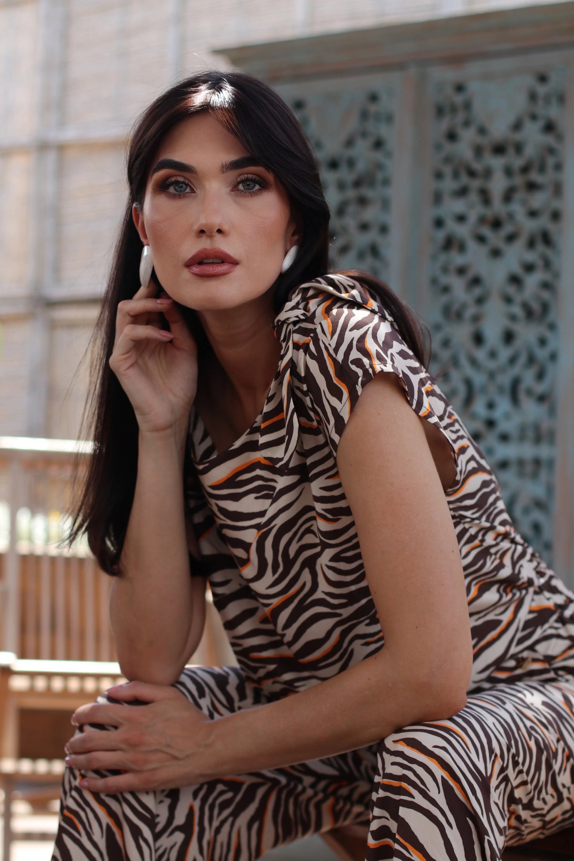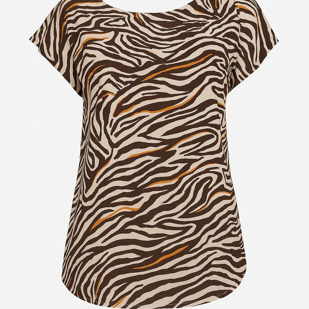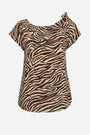 La fantasia zebrata con dettagli arancio su base neutra regala un tocco vivace e originale, mentre il fiocco decorativo posizionato sulla spalla sinistra dona un effetto raffinato e glamour. La linea morbida e la vestibilità comoda la rendono perfetta sia per la città che per un'occasione informale.