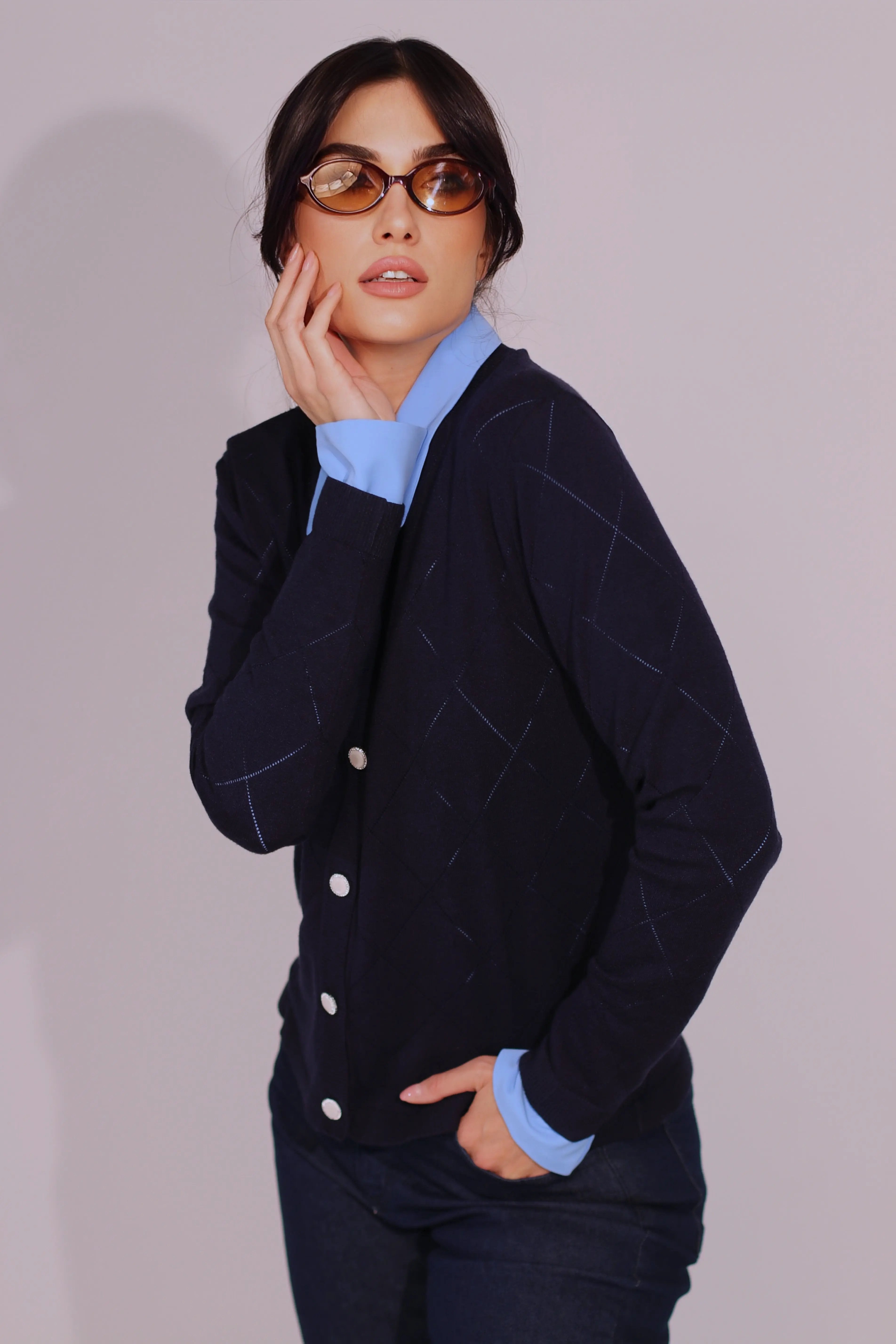 Un cardigan elegante e raffinato in blu intenso, impreziosito da una delicata lavorazione a rombi tono su tono. I bottoni gioiello con bordo luminoso donano un tocco sofisticato e chic, rendendolo il capo perfetto per look casual eleganti o outfit più formali.