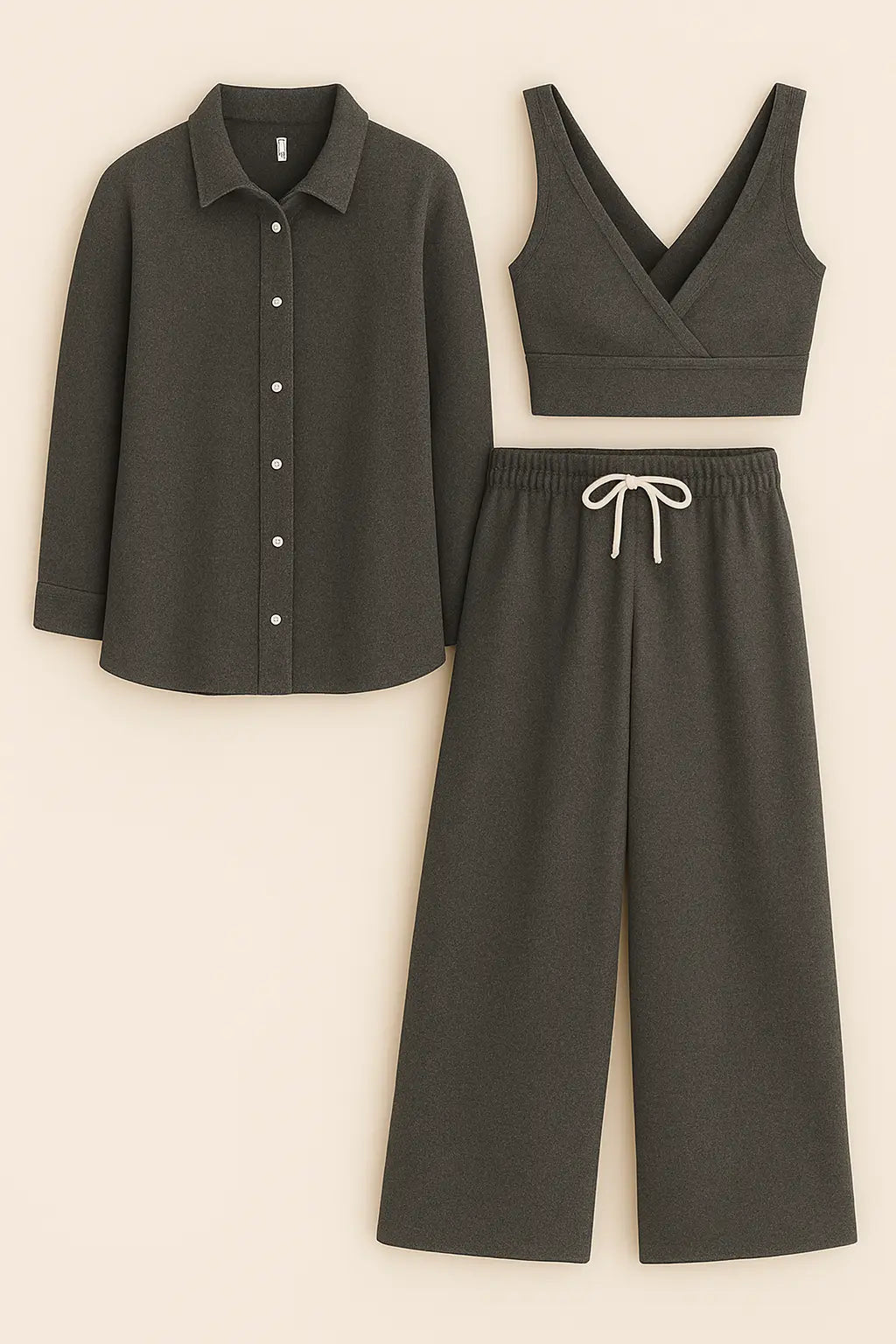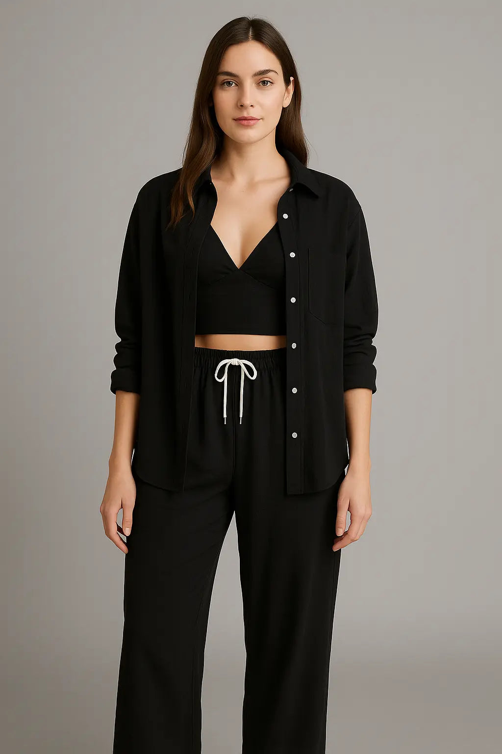 Completo raffinato, versatile e chic tre pezzi, ideale per occasioni casual o in vacanza. Il pantalone jogger con lacci a contrasto permette di creare un look unico e confortevole, sia con la camicia oversize che come overshirt. Il top cropped aggiunge un tocco di femminilità al jogger palazzo. Personalizza il tuo stile con questi capi di alta qualità.