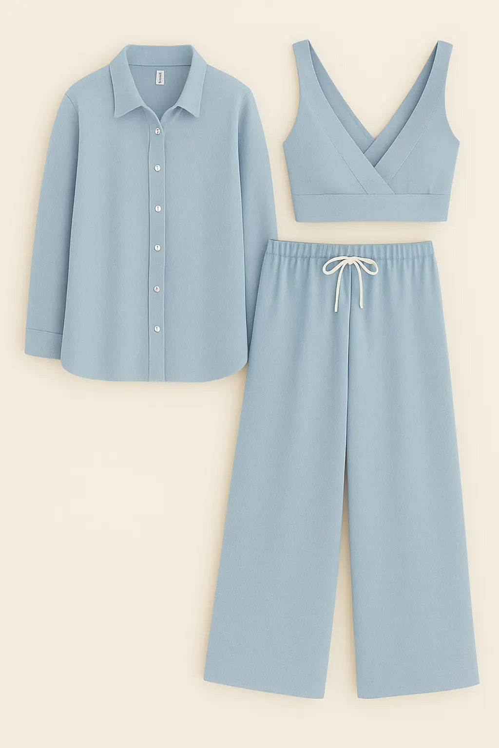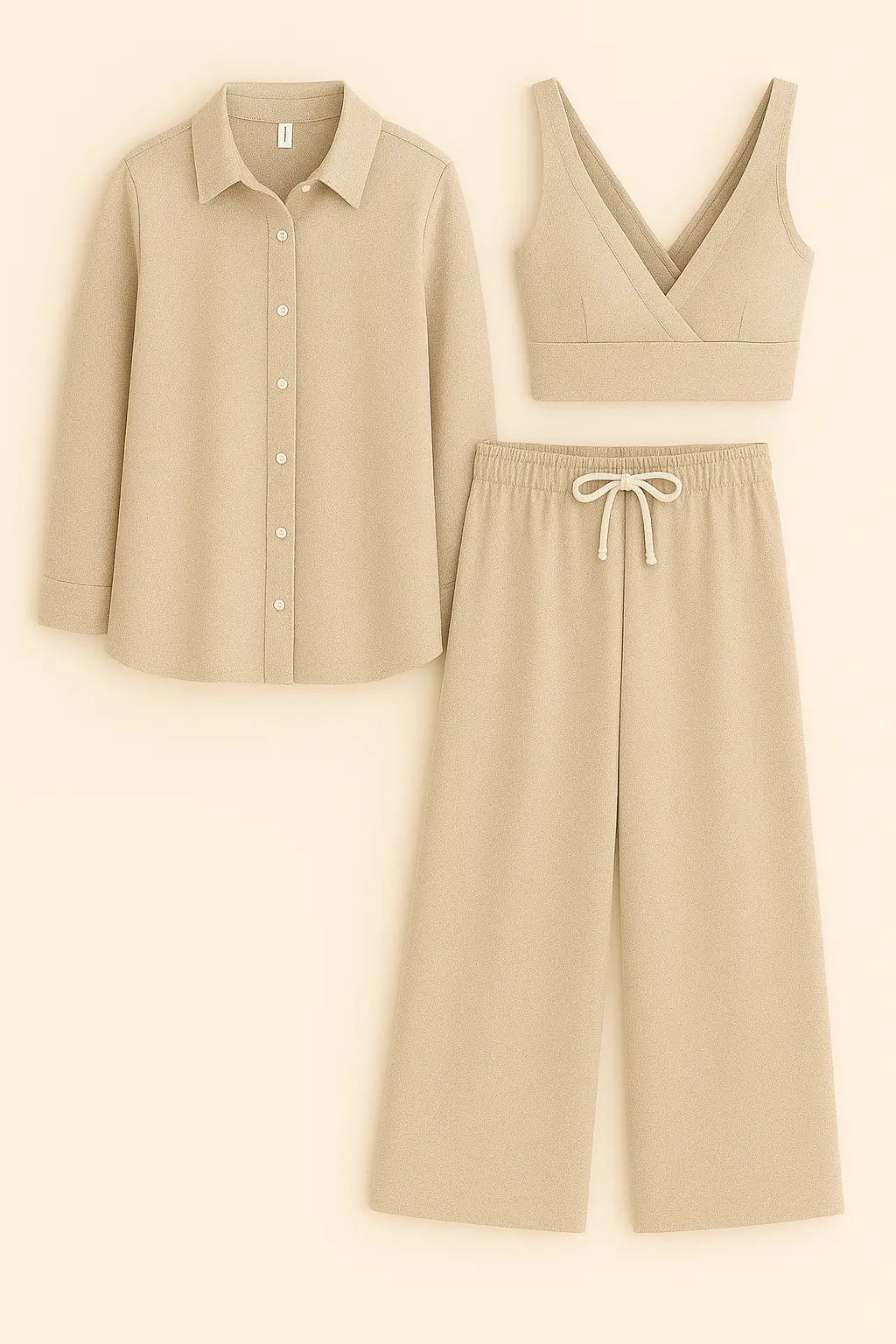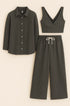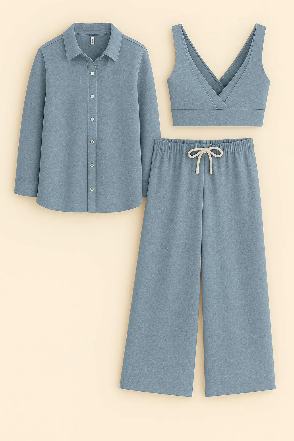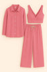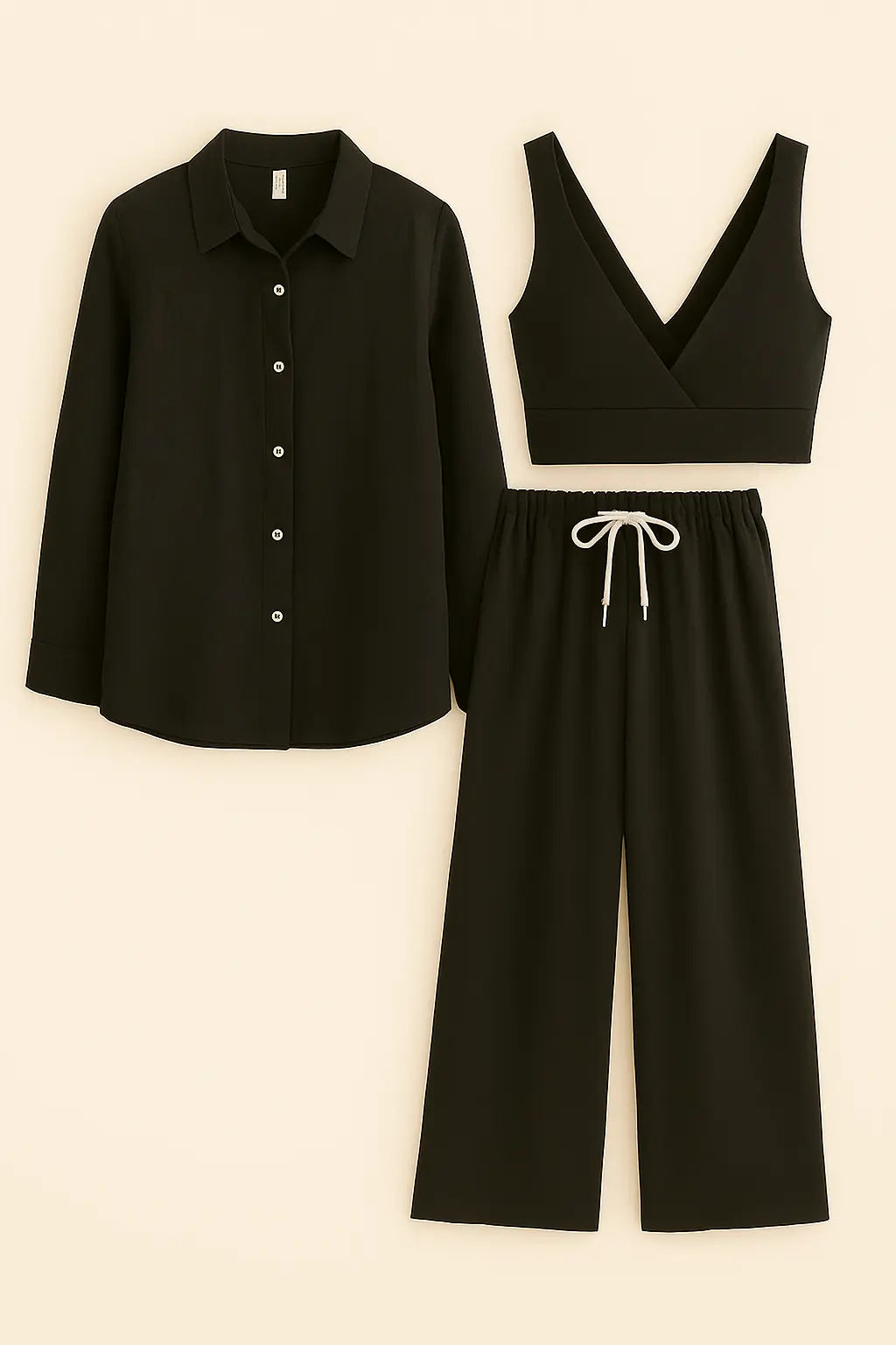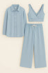 • Completo coordinato in 3 pezzi: camicia, top bralette e pantalone ampio
