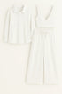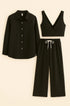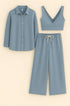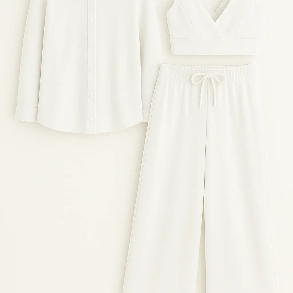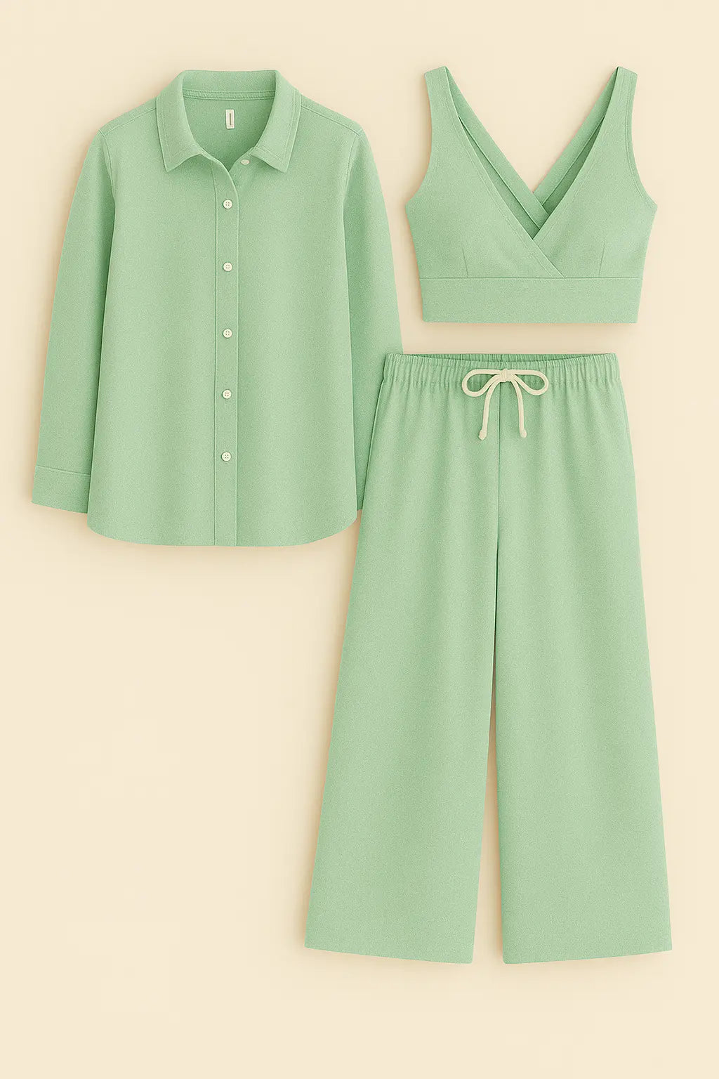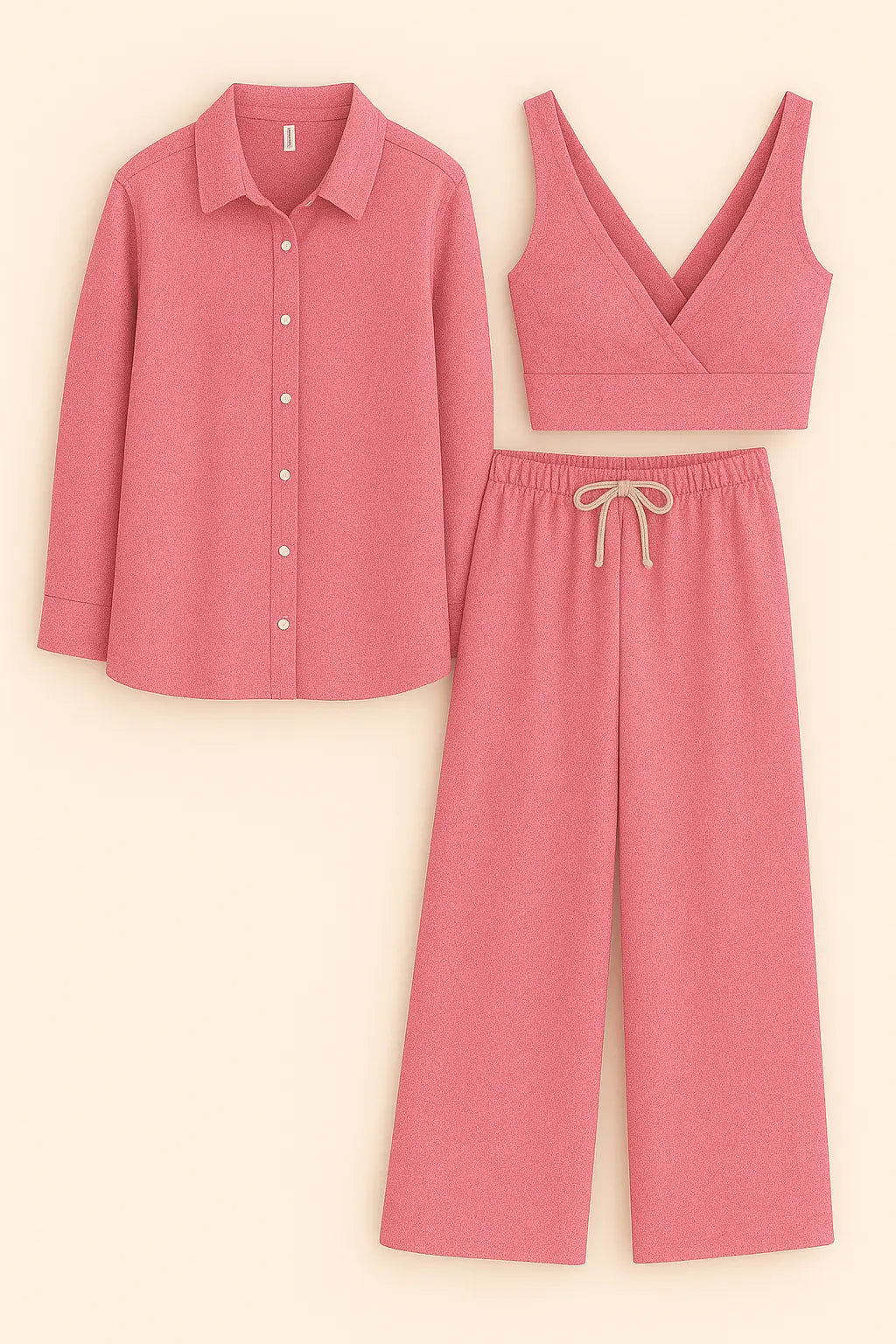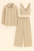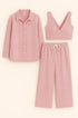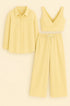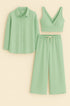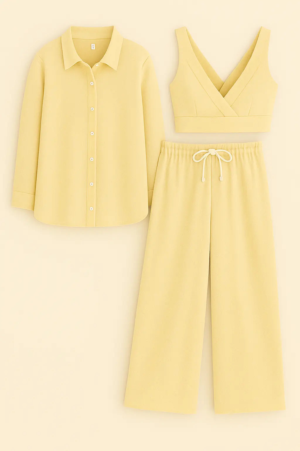 • Completo coordinato in 3 pezzi: camicia, top bralette e pantalone ampio