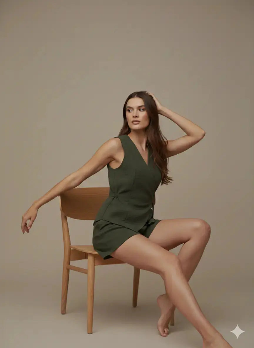 Linee essenziali, taglio moderno e uno stile versatile: questo coordinato composto da gilet a portafoglio e shorts è il look perfetto per un’estate sofisticata e contemporanea. Il gilet senza maniche con chiusura laterale a laccio esalta la silhouette con un taglio incrociato e femminile, mentre gli shorts coordinati, con vita elasticizzata e pinces frontali, completano l’outfit con comfort e carattere.