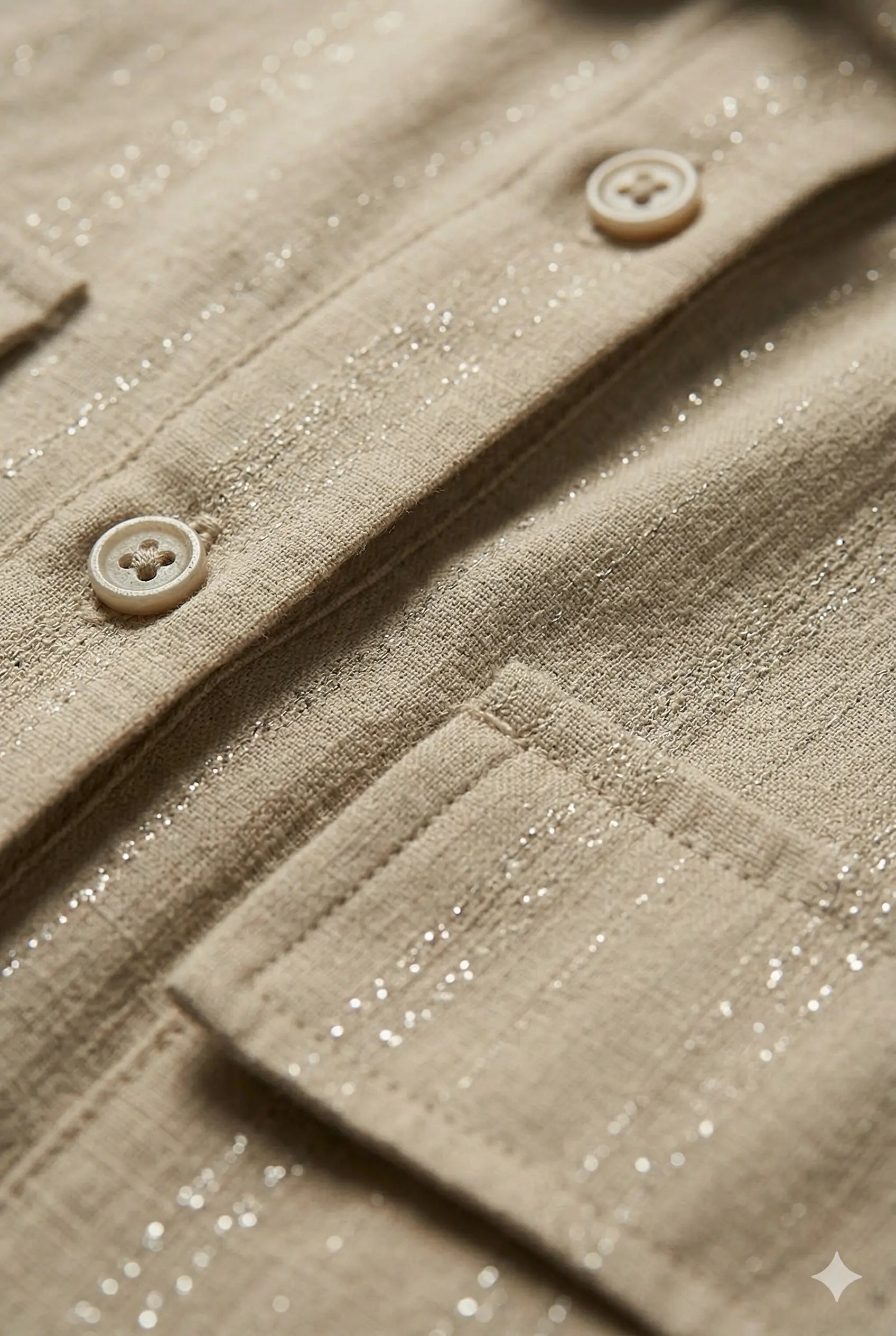 Il design è reso unico da sottili linee verticali di micro-punti luce che percorrono l'intero completo, donando una discreta brillantezza e una silhouette slanciata. Perfetto per una giornata in ufficio o per un aperitivo al tramonto, questo coordinato rappresenta la sintesi ideale tra praticità quotidiana e un'estetica sofisticata e luminosa.