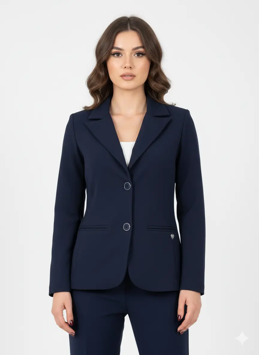 Realizzata in tessuto fluido e strutturato, presenta due bottoni frontali metallici che donano carattere al capo e un dettaglio 💙🤍 logo gioiello a cuore sul taschino. Perfetta per look formali o per dare un tocco chic ad outfit casual, disponibile in due varianti colore: blu navy e nero classico.