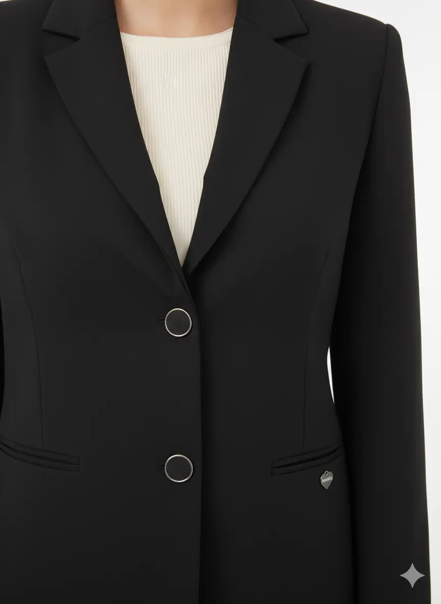 Un capo intramontabile che non può mancare nel guardaroba femminile: questa giacca nera, dal taglio classico ma reso unico dai bottoni gioiello e dal dettaglio logo sul taschino, è perfetta per look raffinati sia da giorno che da sera.