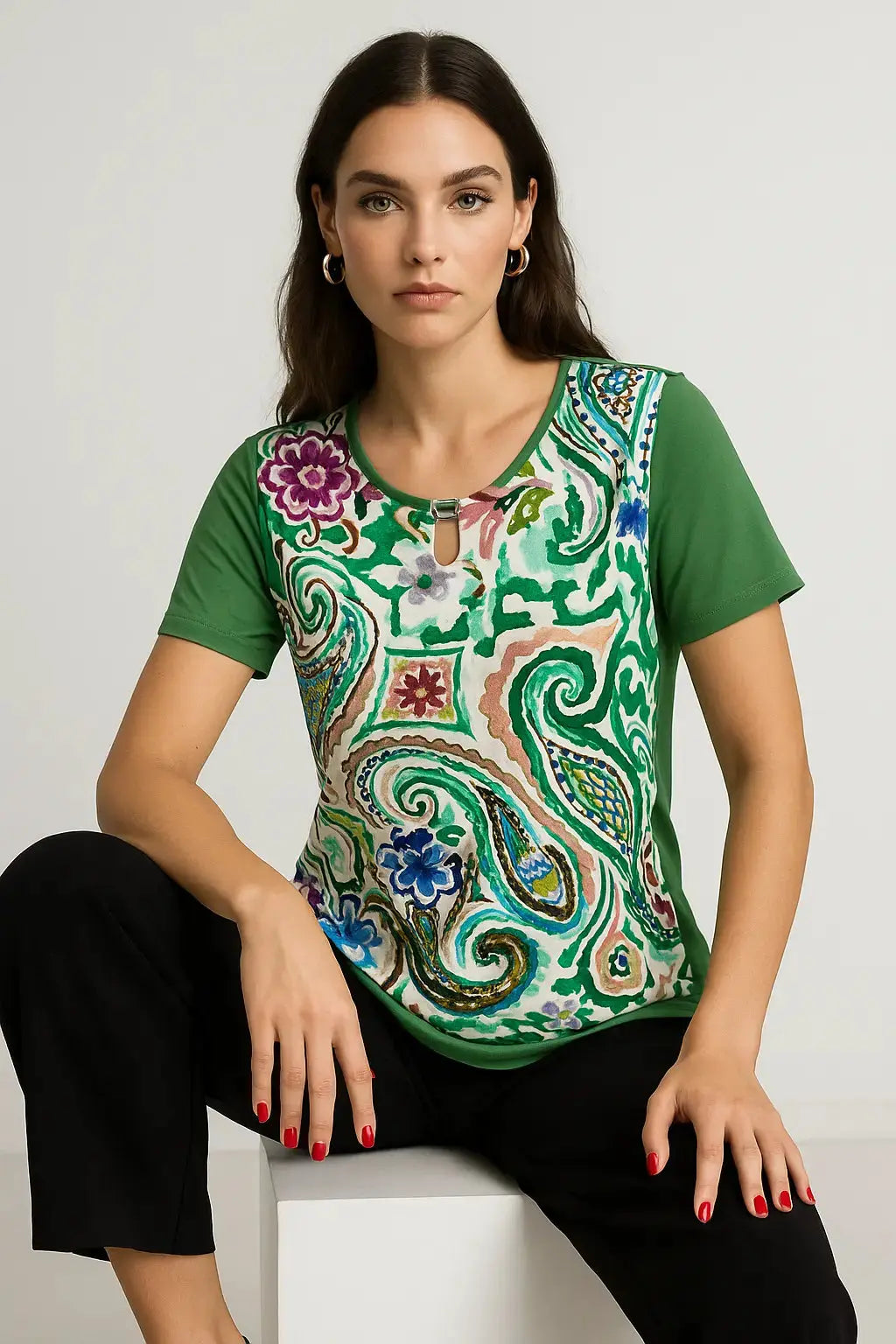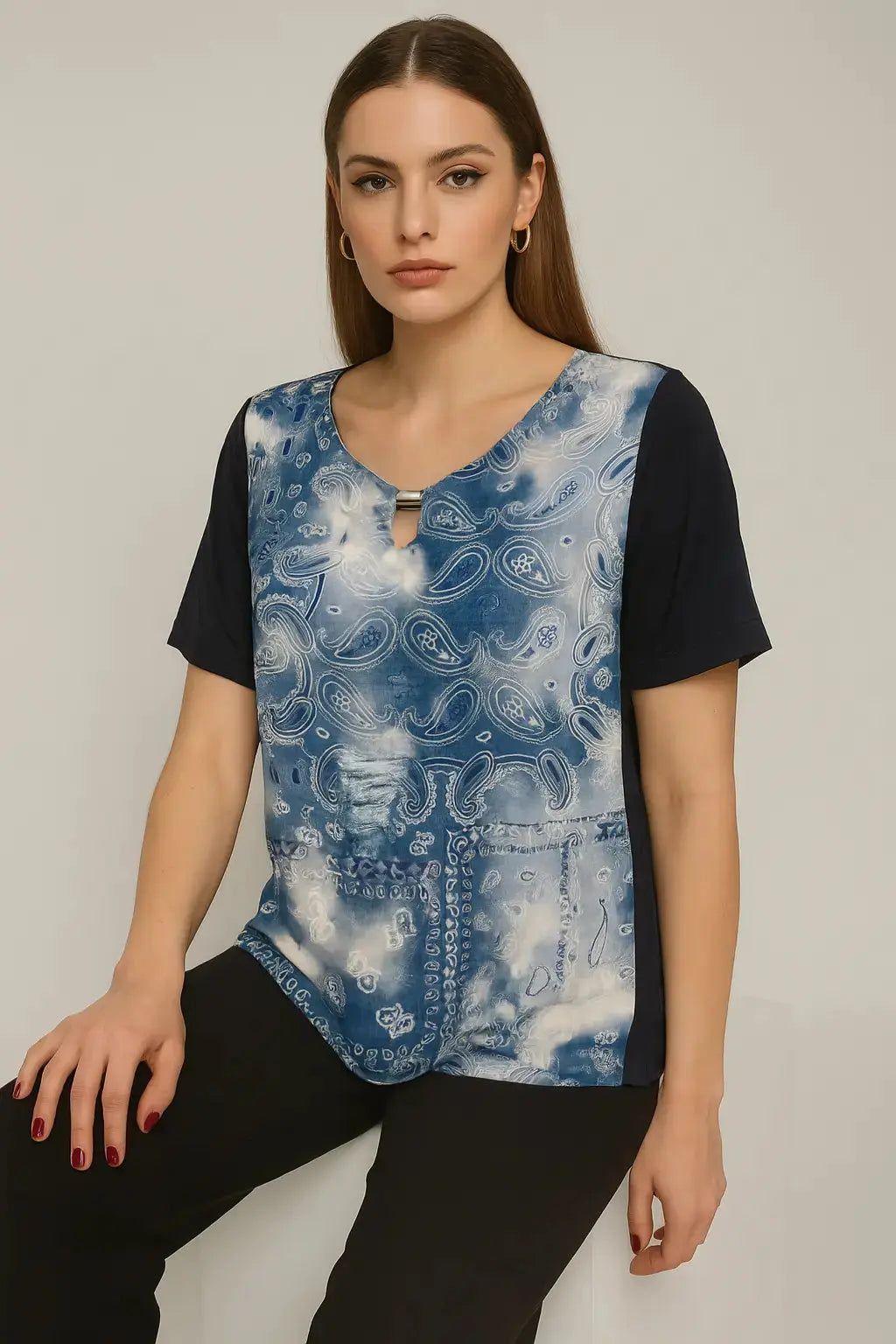 Aggiungi un tocco vivace al tuo guardaroba con questa t-shirt girocollo a manica corta, caratterizzata da un raffinato dettaglio a goccia con inserto metallico sul davanti. Il pannello frontale è decorato da fantasie multicolore in stile paisley, floreale o astratto, mentre il retro e le maniche in tinta unita donano equilibrio e sobrietà al capo.