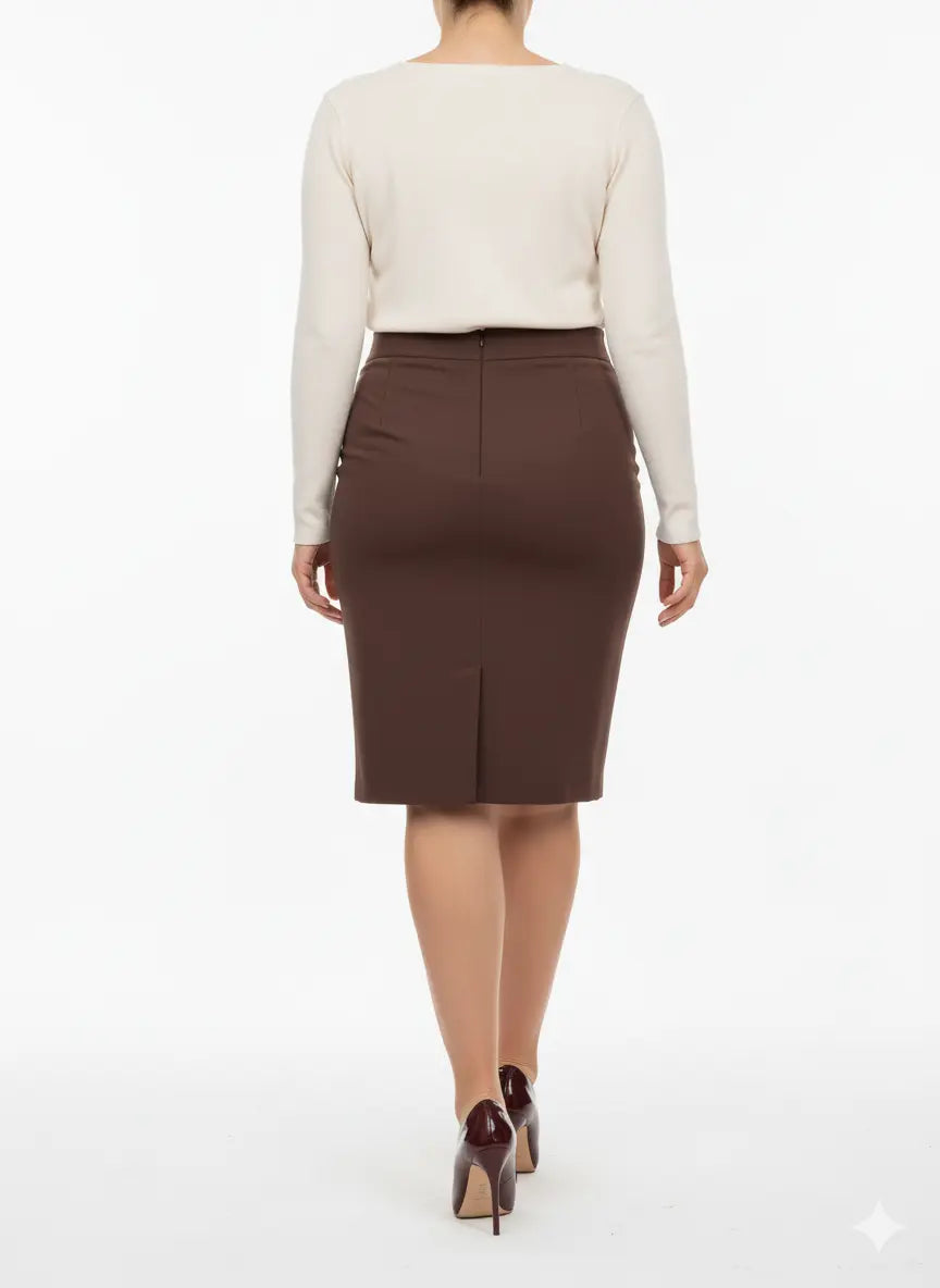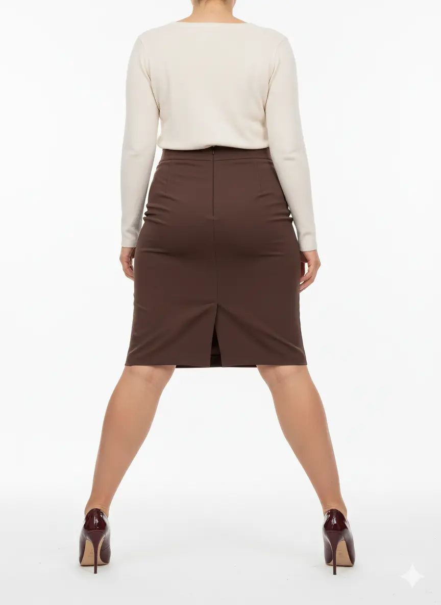 La gonna a tubino è un classico intramontabile del guardaroba femminile, e questo modello in color cioccolato ne è l'esempio perfetto. Realizzata in tessuto stretch confortevole, valorizza le forme con discrezione e classe. Perfetta per l’ufficio, un’occasione speciale o un look raffinato da giorno.