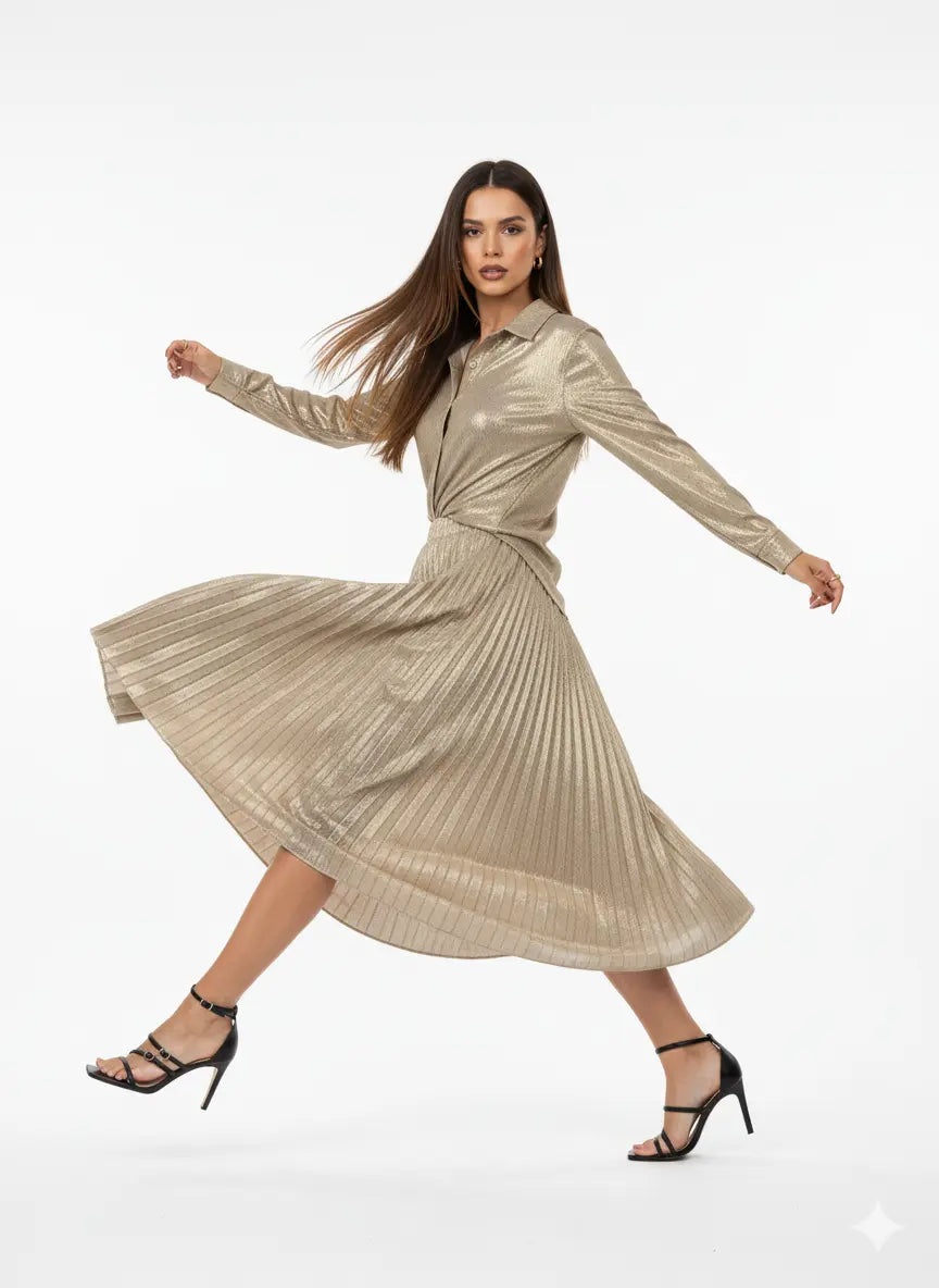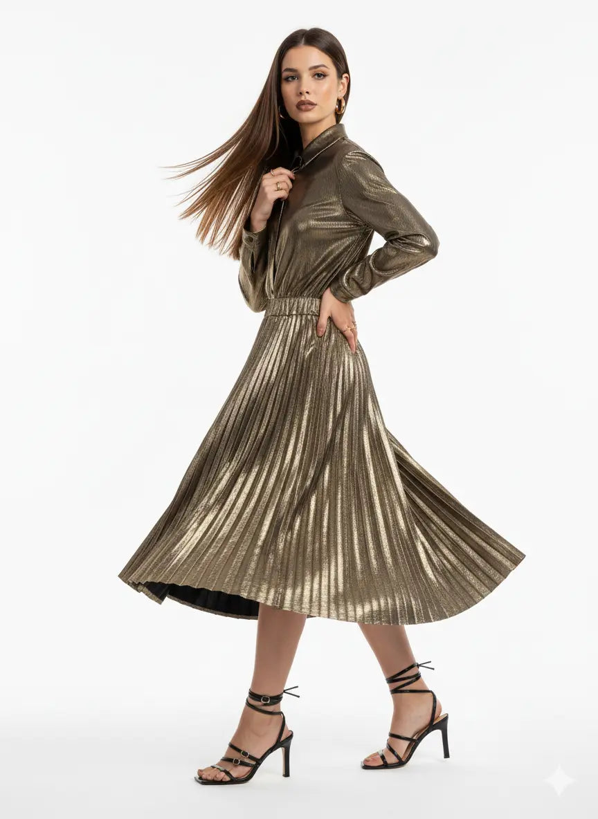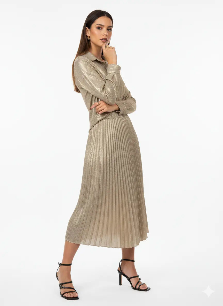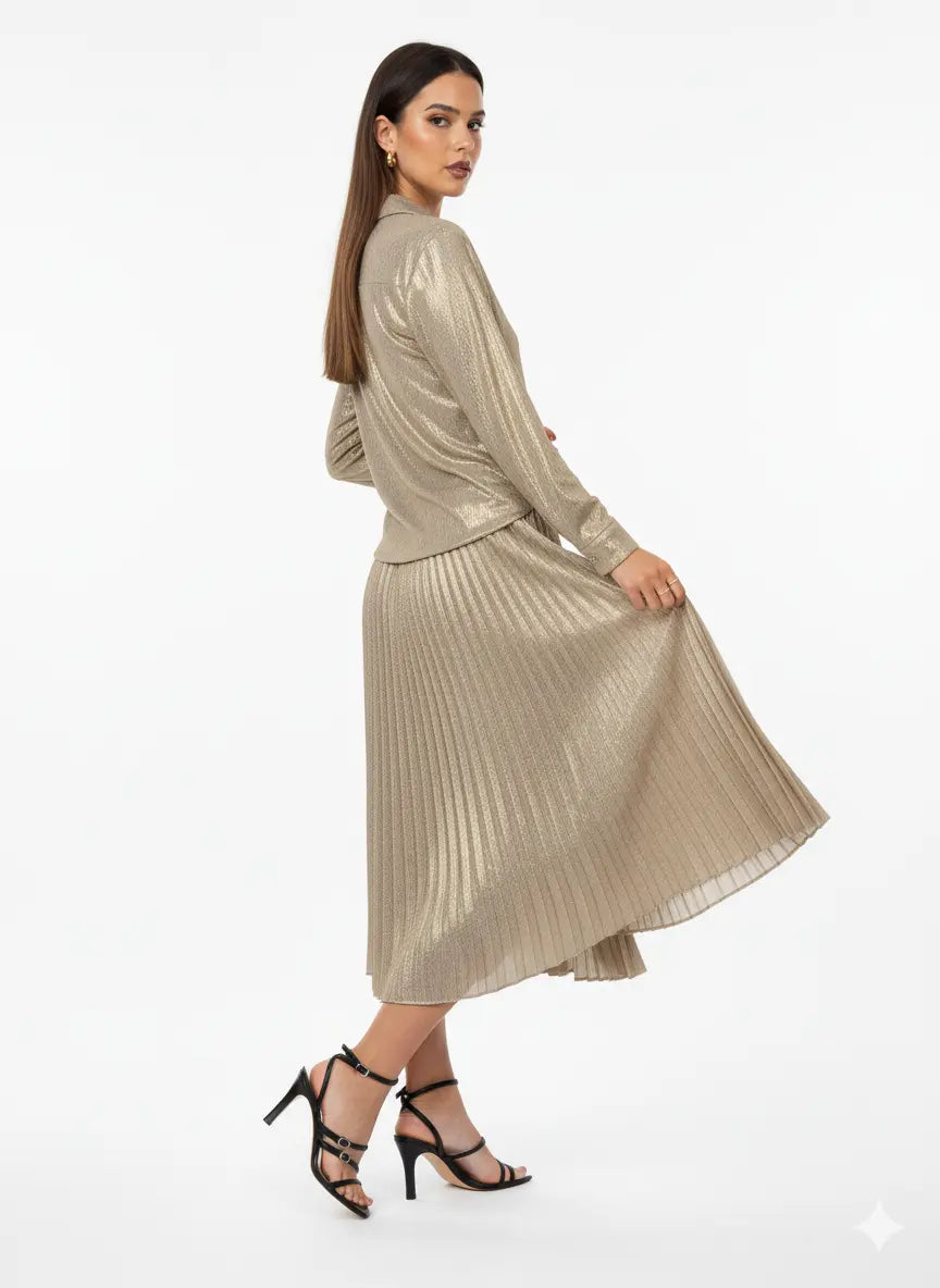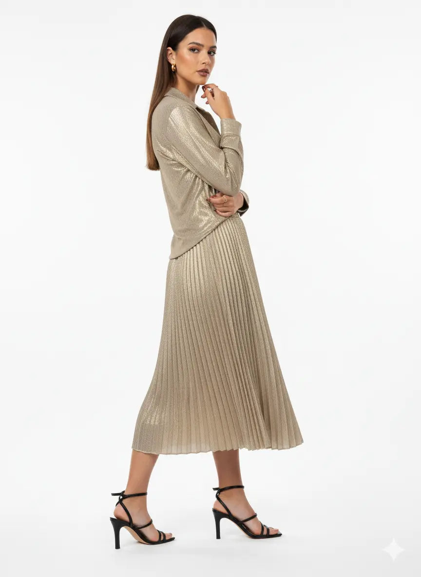 Una gonna lunga plissé dall’effetto metallizzato spettacolare, leggera, scintillante e ideale per look glam da sera. Il design fluido e il tessuto luminoso la rendono un capo protagonista, perfetto per feste, eventi, cene speciali o per dare un twist fashion anche a un look basico.