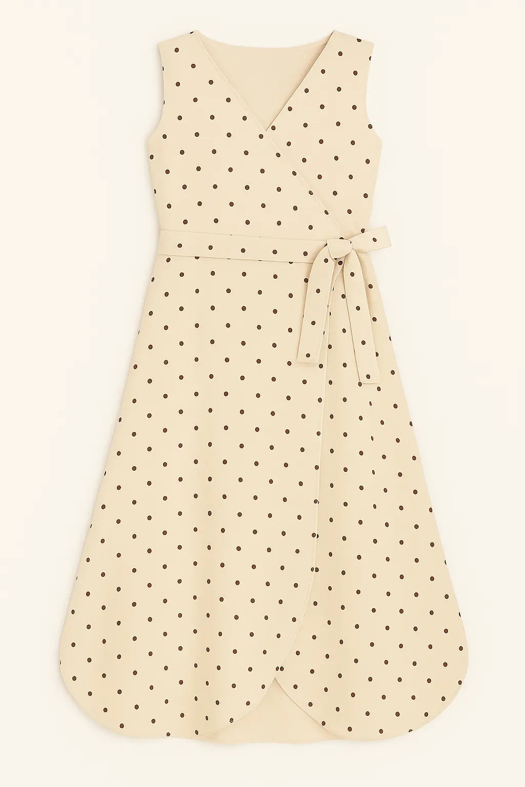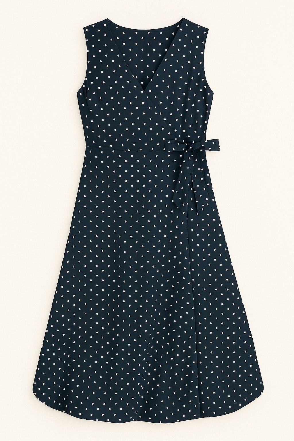 Fresco, sofisticato e senza tempo: questo abito a portafoglio con stampa a pois è perfetto per ogni occasione, dall’ufficio all’aperitivo. Il taglio svasato con fondo a palloncino valorizza la figura con un tocco di eleganza rétro.