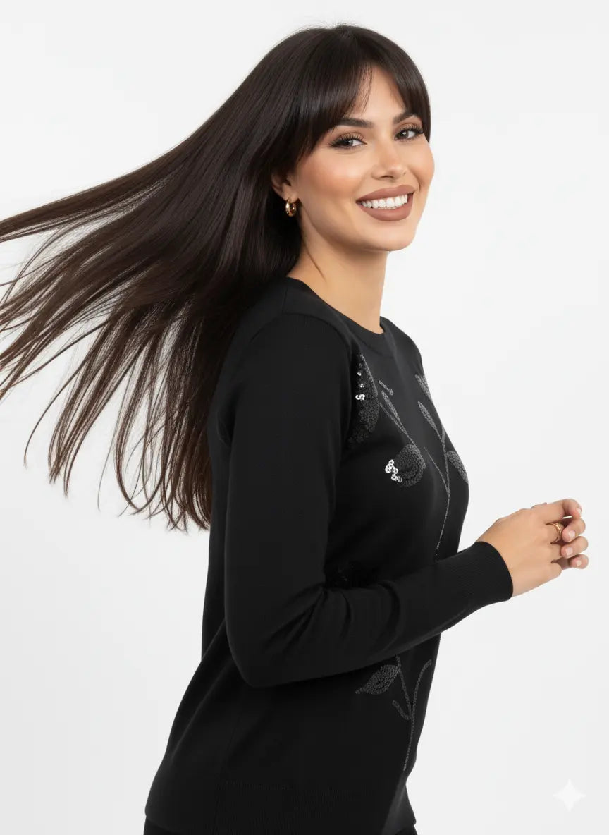 Un capo elegante e luminoso, perfetto per dare un tocco chic al tuo look quotidiano. Questa maglia a maniche lunghe in morbido tessuto si distingue per i dettagli in paillettes ricamati a motivo floreale, che catturano la luce con discreta raffinatezza. Facile da abbinare sia con jeans casual che con pantaloni eleganti. 🌙