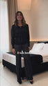 Realizzata in un morbido filato nero, questa maglia è impreziosita da applicazioni di strass disposte in linee verticali che valorizzano la figura.