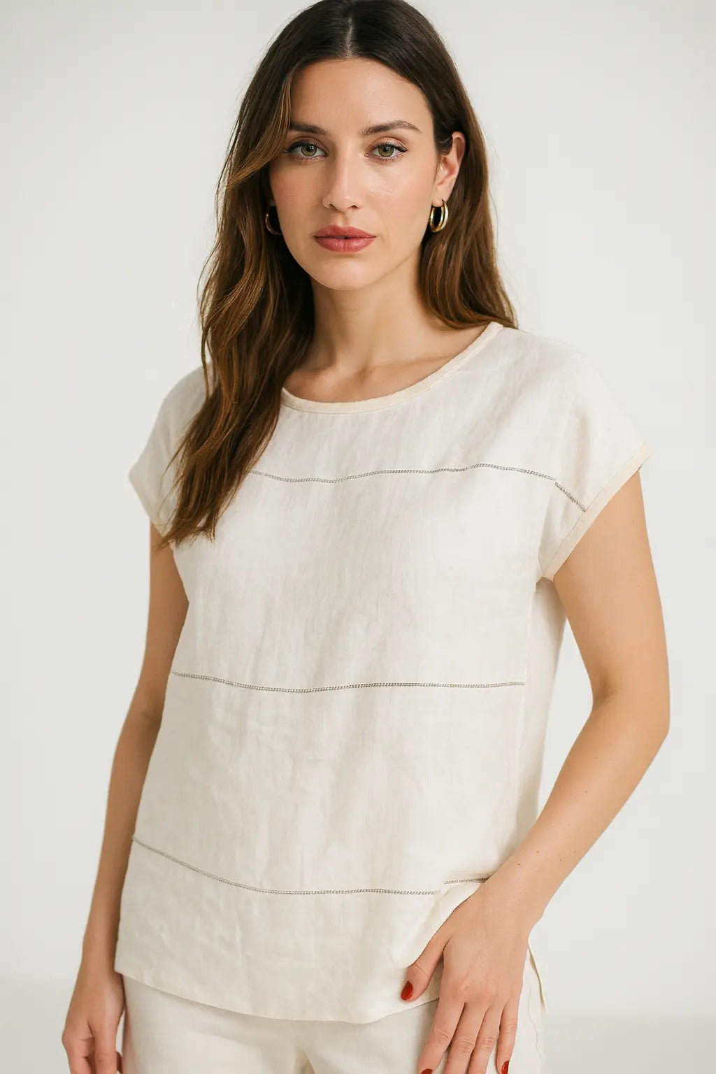 Questa Maglia in misto lino e rayon con passamaneria frontale offre una vestibilità fresca e comoda grazie al tessuto leggero e traspirante in misto rayon e lino. Con il suo scollo a barca e il dettaglio di passamaneria frontale in microchain silver, aggiunge un tocco elegante e raffinato al tuo look.