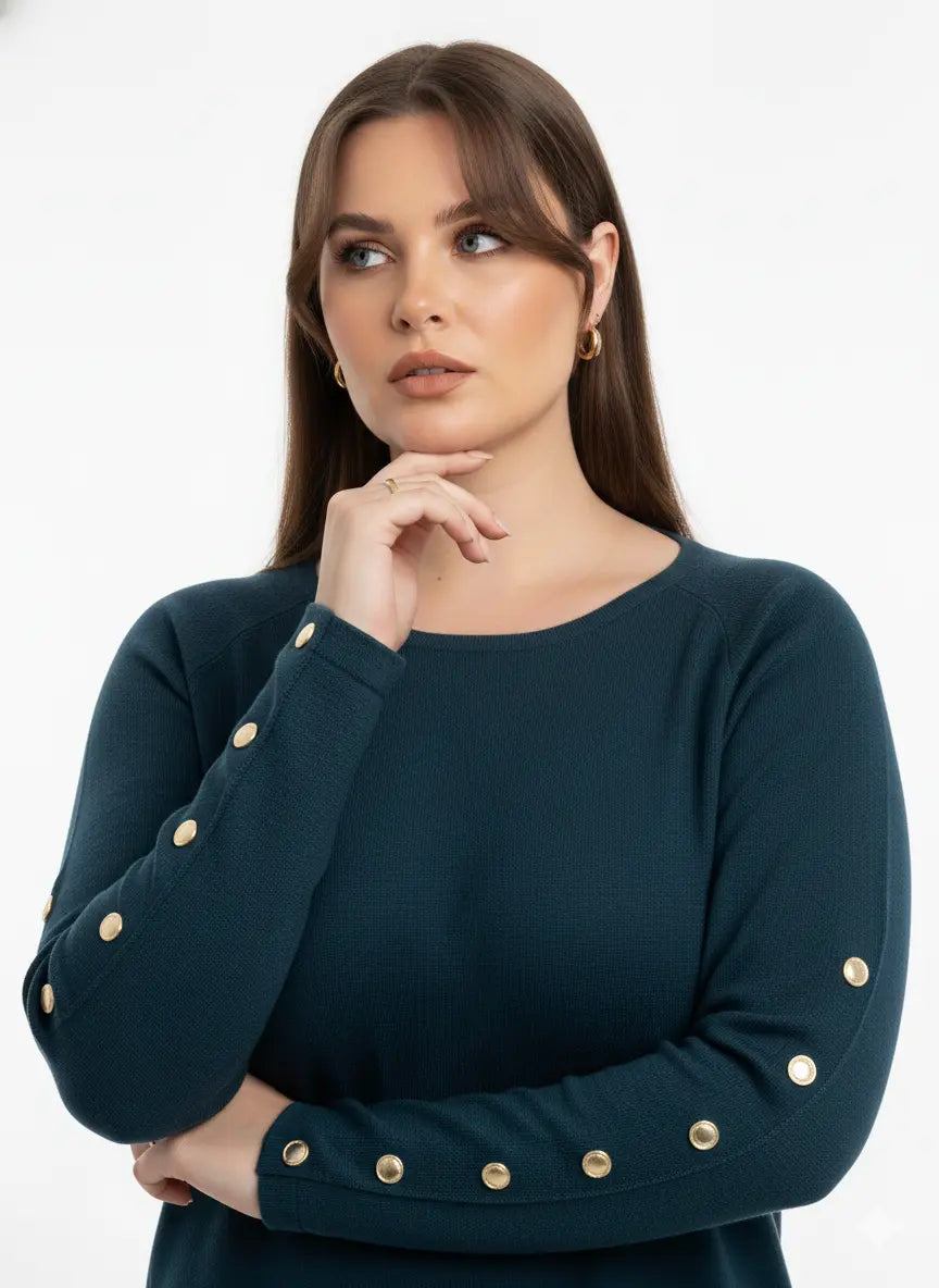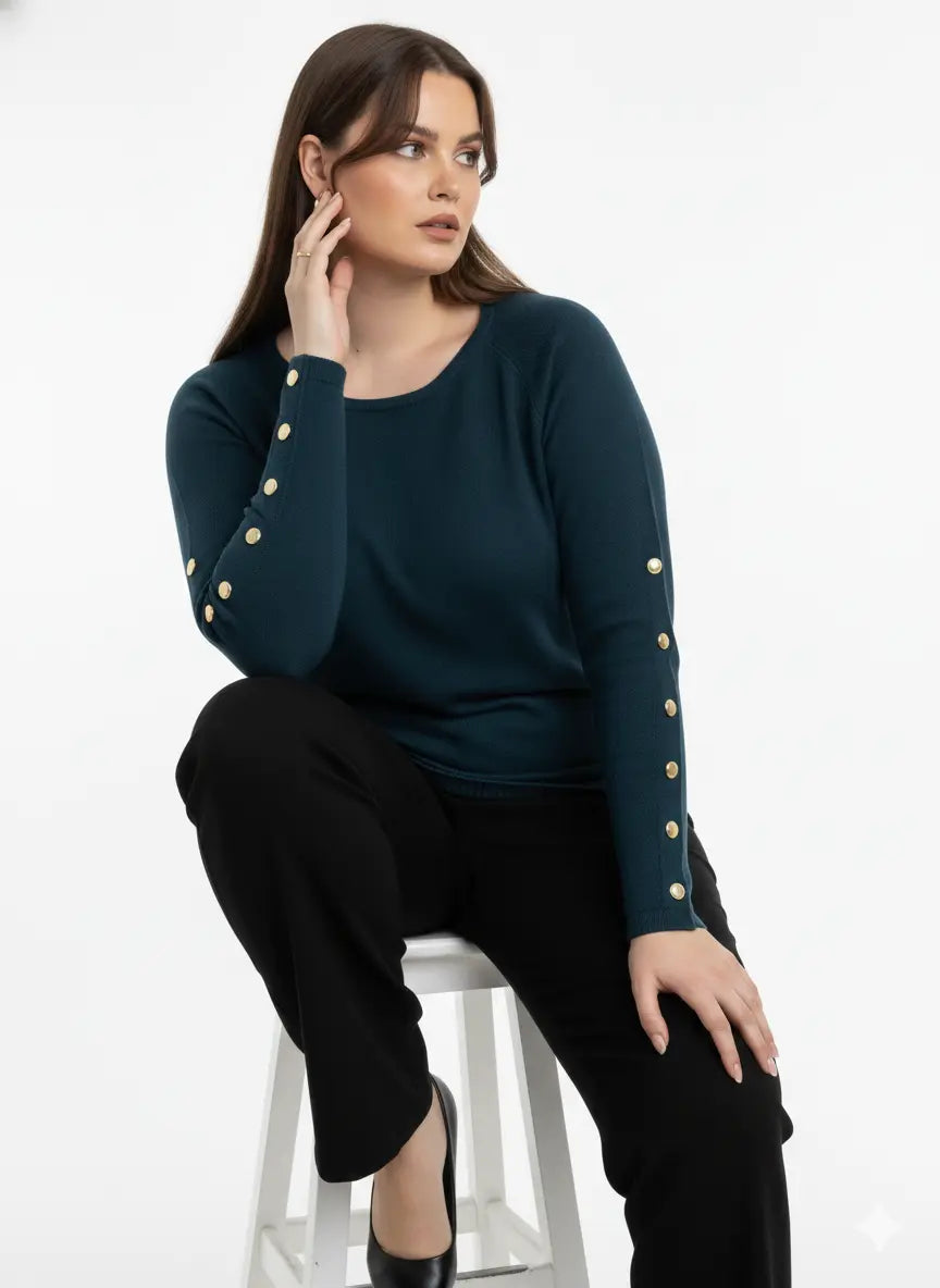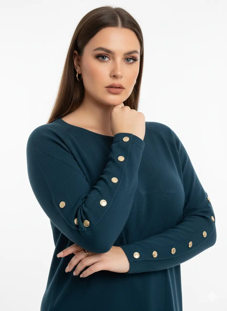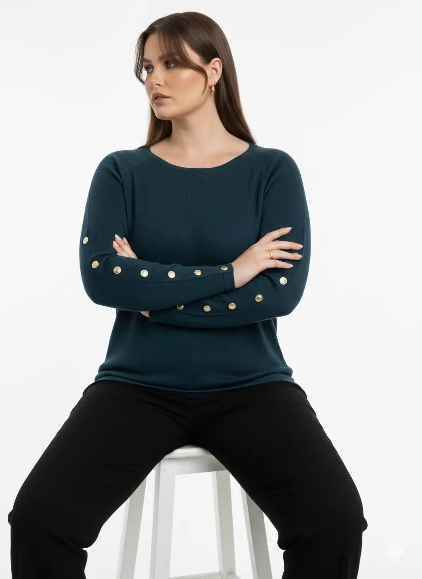 Un capo elegante e raffinato che unisce semplicità e dettagli di classe. Questa maglia dal taglio morbido è caratterizzata da una linea pulita e contemporanea, impreziosita dai bottoni metallici dorati applicati lungo le maniche, che aggiungono un tocco luminoso e sofisticato.