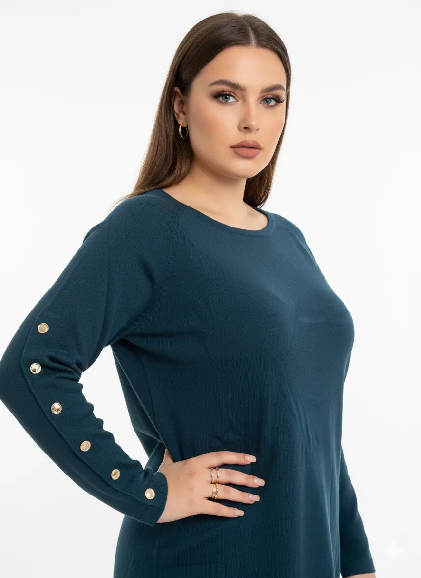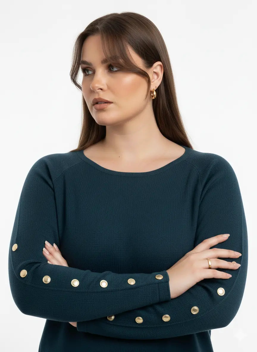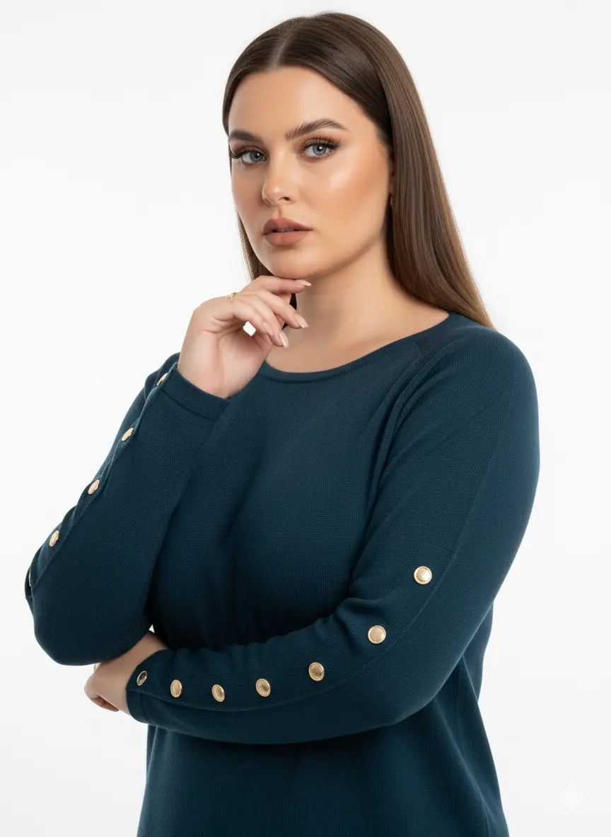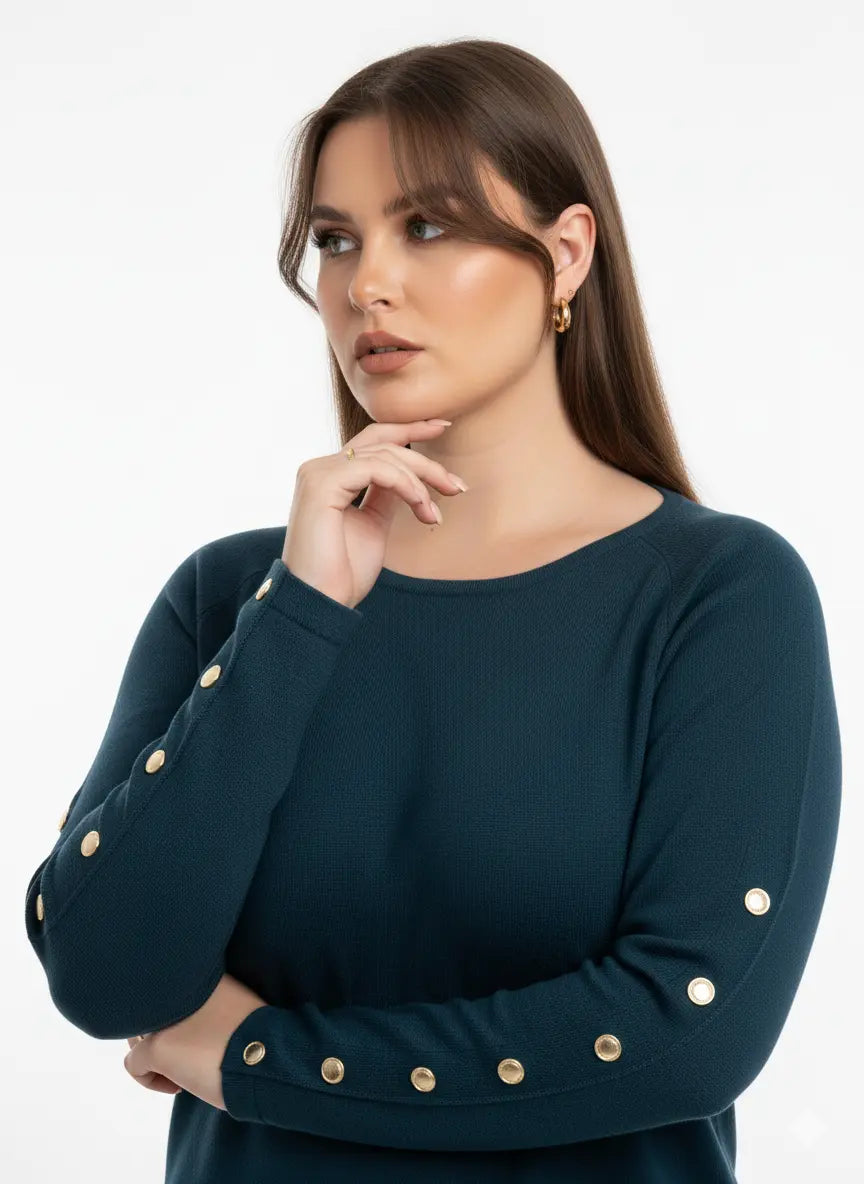 Un capo elegante e raffinato che unisce semplicità e dettagli di classe. Questa maglia dal taglio morbido è caratterizzata da una linea pulita e contemporanea, impreziosita dai bottoni metallici dorati applicati lungo le maniche, che aggiungono un tocco luminoso e sofisticato.