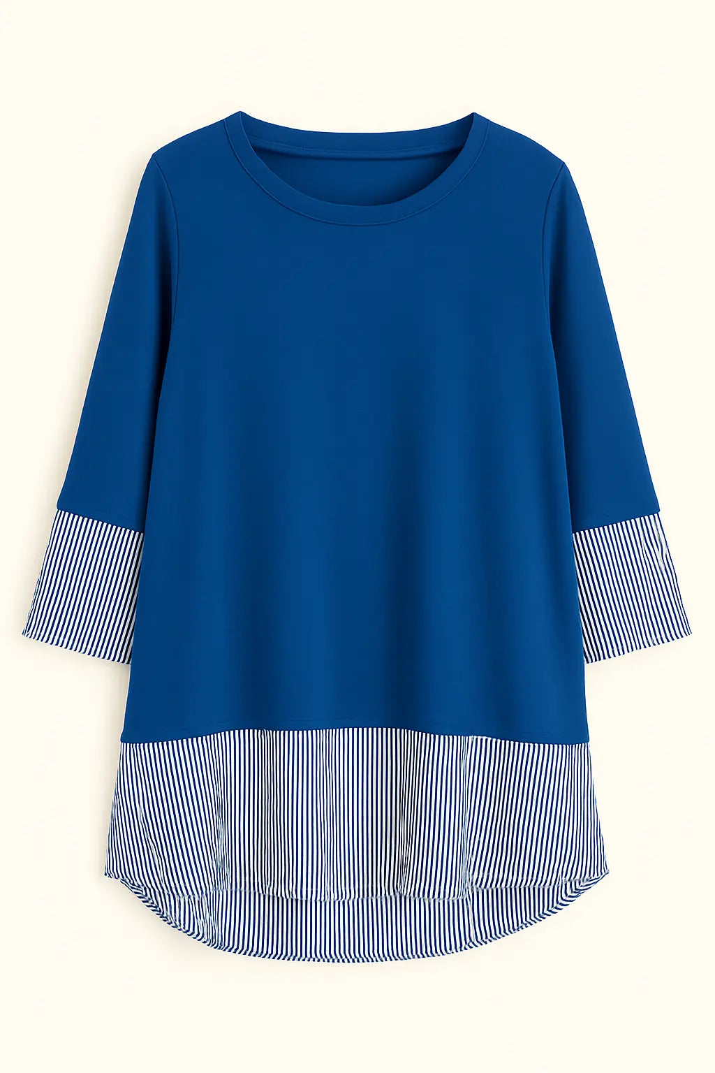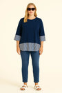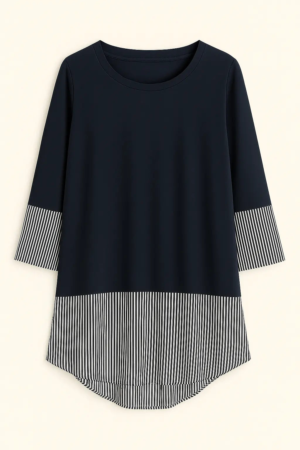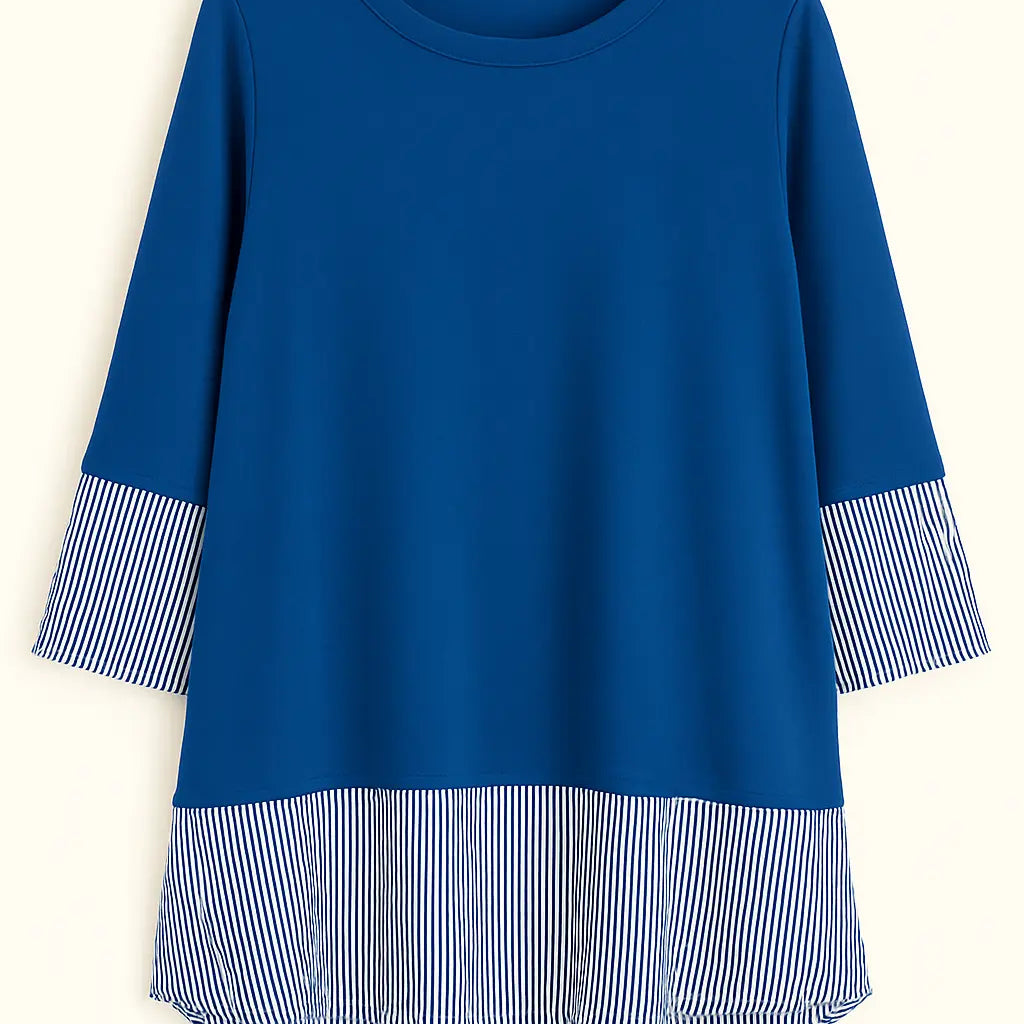 Rinnova il tuo guardaroba con questa raffinata blusa tunica, pensata per offrire comfort ed eleganza in ogni occasione. Il corpo in morbido tessuto blu navy è impreziosito da dettagli a righe sottili su fondo bianco, posti strategicamente sulle maniche e sull’orlo inferiore, creando un originale effetto doppio. La linea leggermente svasata e il taglio più lungo sul retro donano un fit fluido e femminile, perfetto da abbinare sia a pantaloni slim che a jeans.