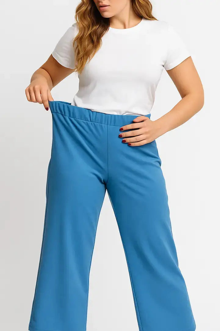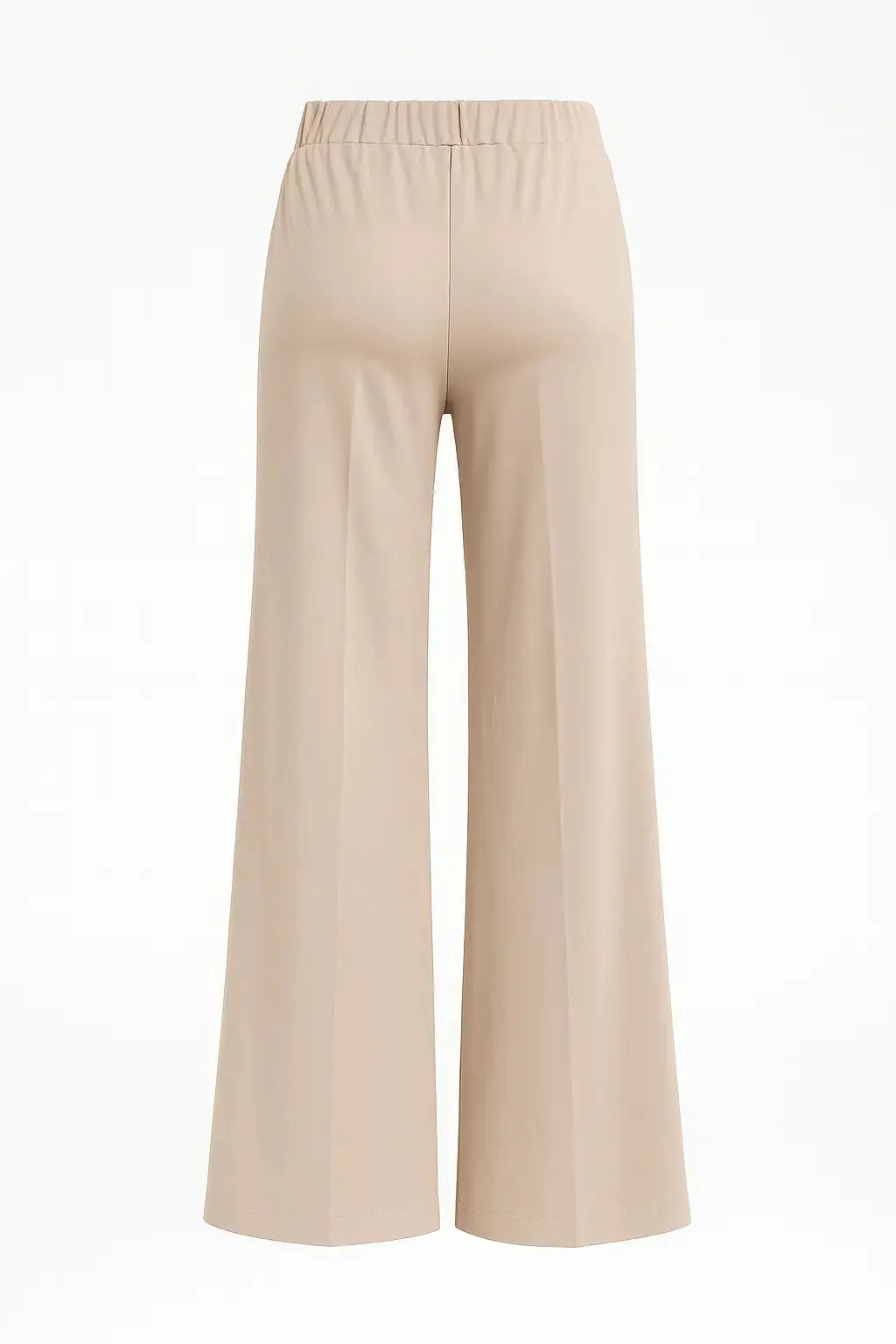 Pantalone palazzo in viscosa con elastico in vita che unisce comfort e eleganza. La gamba ampia e fluida valorizza la silhouette, mentre il tessuto morbido garantisce libertà di movimento tutto il giorno. Perfetto per passare dal casual al formale, si abbina facilmente a qualsiasi capo.