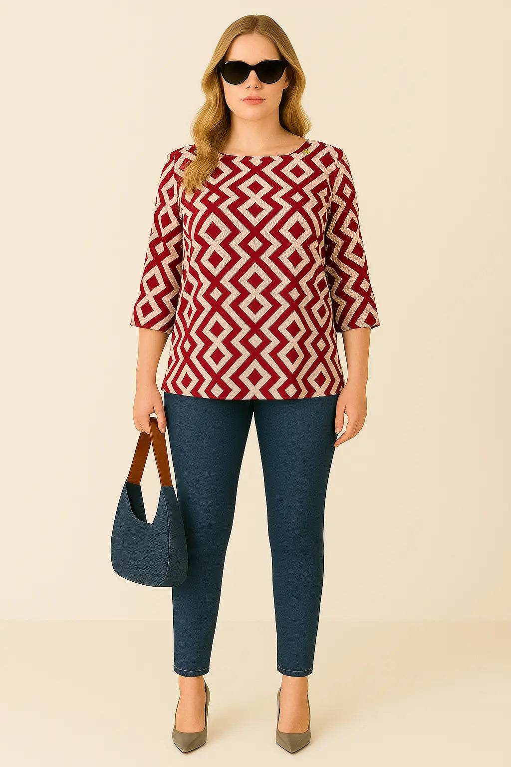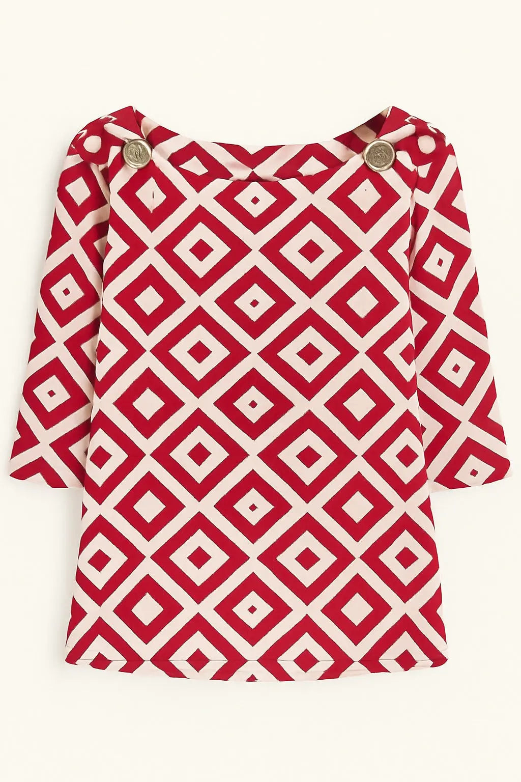 Questa maglia stampata presenta un morbido tessuto stretch che si adatta perfettamente al tuo corpo. Il suo scollo a barca e i bottoni decorativi aggiungono un tocco di stile, rendendola perfetta da mattina a sera. Abbinatela a un tailleur in color block per un look professionale o ad un pantalone dal fit comfort per un look casual.