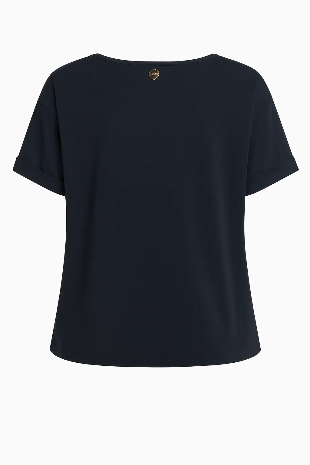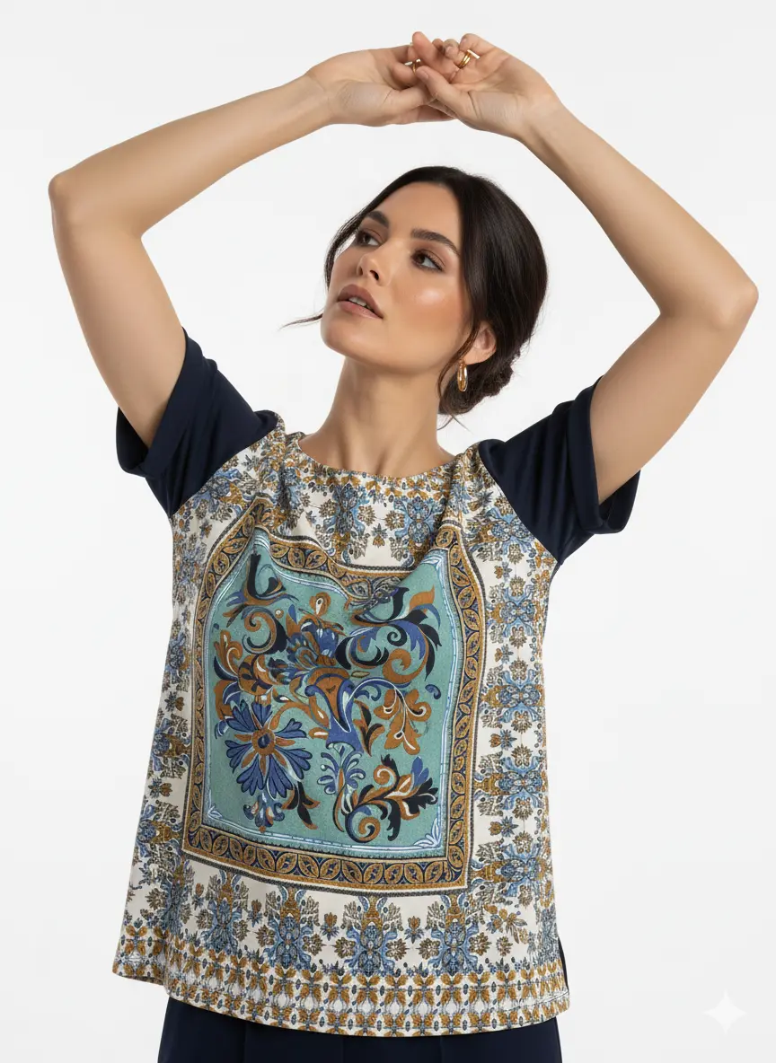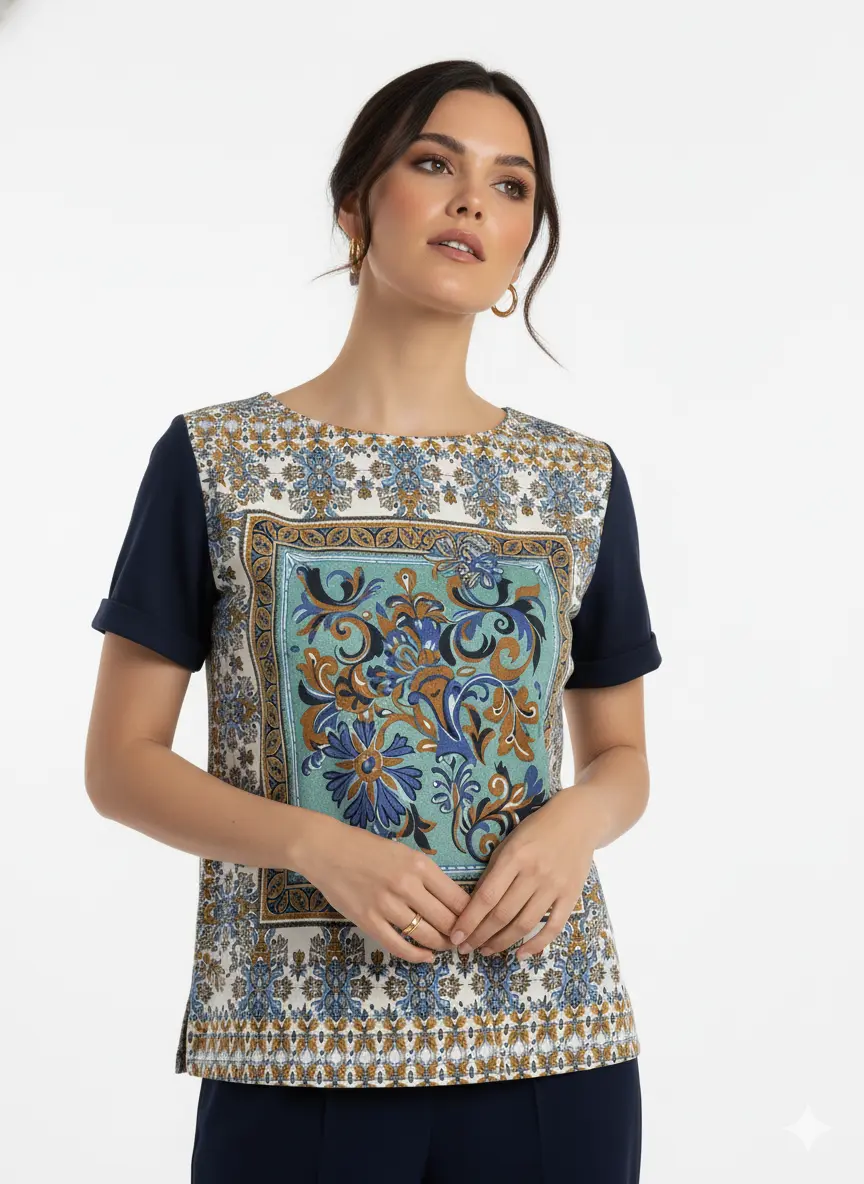 Questa t-shirt bi-materiale unisce eleganza e comfort con un design ricercato. Il fronte in tessuto satinato con stampa barocca e floreale dai toni blu, oro e azzurro richiama l’effetto di un foulard prezioso, mentre il retro e le maniche in tessuto tinta unita garantiscono praticità e vestibilità. Un capo versatile che dona un tocco sofisticato anche agli outfit più casual.