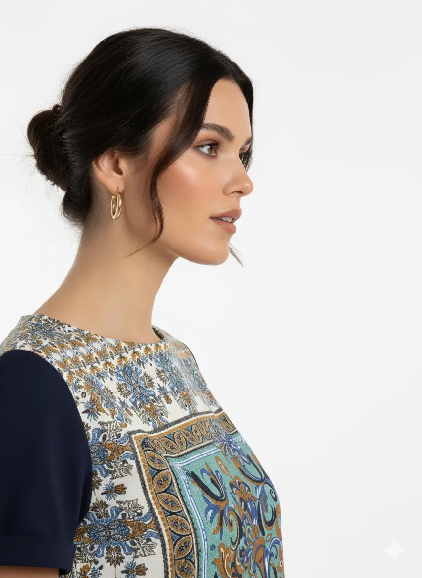 Dettagli frontali: stampa effetto foulard con motivi floreali e barocchi nei toni del blu, oro e azzurro
